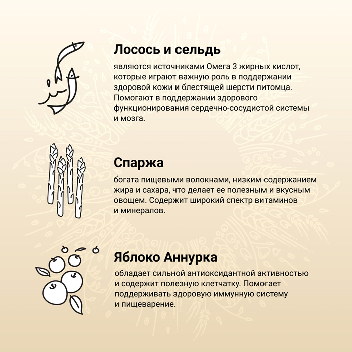 Состав: лосось (15%), дегидратированный белок сельди (15%), сельдь (11%), дегидратированный белок лосося (11%), рыбий жир (лососевый), гидролизованный рыбий белок (треска, пикша), льняное семя, спельта, бурый рис, ячмень, овес, просо, сухая свекольная пульпа, люцерновая мука, волокна гороха, сушеное яблоко (0,5%), сушеная спаржа (0,5%), сушеная черника, сушеная клюква, сушеная ацерола, инулин цикория (0,4%), дрожжевой экстракт (источник маннанолигосахаридов) (0,3%), фруктоолигосахариды (0,3%), аскофиллум узловатый (Ascophyllum Nodosum), карбонат кальция, монокальцийфосфат, хлорид калия, хлорид натрия, сухие пивные дрожжи, глюкозамин, хондроитина сульфат, алоэ вера, розмарин, куркума, календула, семена и шелуха подорожника, юкка Шидигера. Питательная ценность: сырой белок 32%; сырой жир 18%; сырая клетчатка 1,8%; сырая зола 6,9%; кальций - 1,1%; фосфор - 0,9%; Омега-6 жирные кислоты - 2,1%; Омега-3 жирные кислоты - 1,1%; докозагексаеновая кислота (ДГК) - 0,6%; эйкозапентаеновая кислота (ЭПК) - 0,3%; глюкозамин – 1 300мг/кг, хондроитина сульфат - 1 000мг/кг. Энергетическая ценность: 4272 ккал/кг. Питательные добавки на 1 кг: витамин А – 18000ME; витамин D3 – 1800ME; витамин Е – 215мг; витамин С – 180мг; ниацинамид - 54мг; D-пантенол - 22,5мг; витамин B2 - 11,2мг; витамин B6 - 6,7мг; витамин B1 - 11,2мг; биотин - 0,54мг; фолиевая кислота - 0,54мг; витамин B12 - 0,09мг; холина хлорид - 2700мг; Цинк (Хелат цинка гидрата глицина) - 84,6мг; Марганец (Хелат марганца гидрата глицина) - 18мг; Железо [Хелат железа (II) гидрата глицина] - 64,6мг; Медь [Хелат меди (II) гидрата глицина] - 12,6мг; Йод (безводный йодат кальция) - 1,8мг; Cелен (L-селенометионин) - 0,31мг; DL-метионин, технически чистый 3000мг; Tаурин 990мг; L-карнитин 200мг. Антиоксиданты: экстракт токоферолов из растительных масел.
