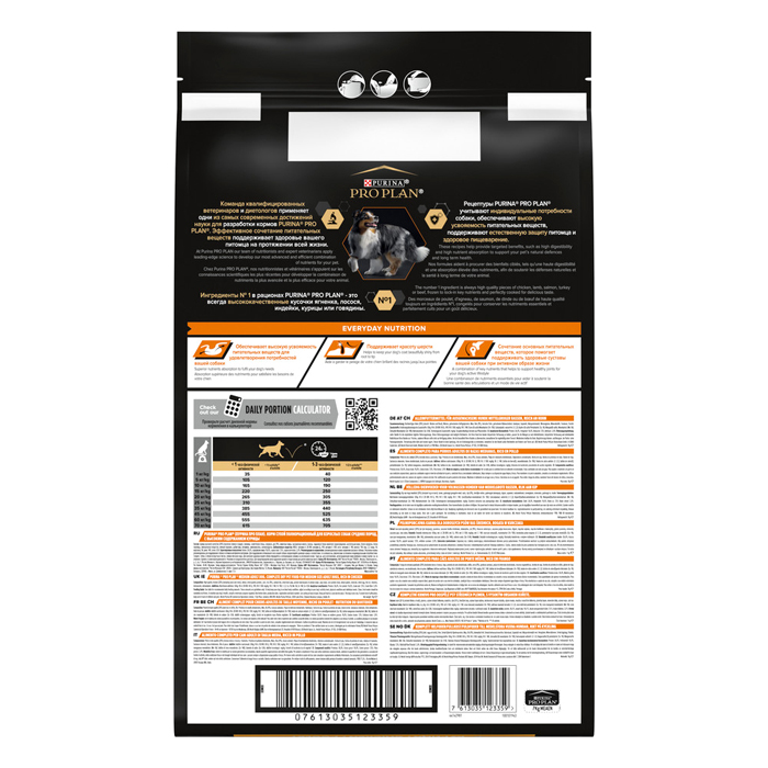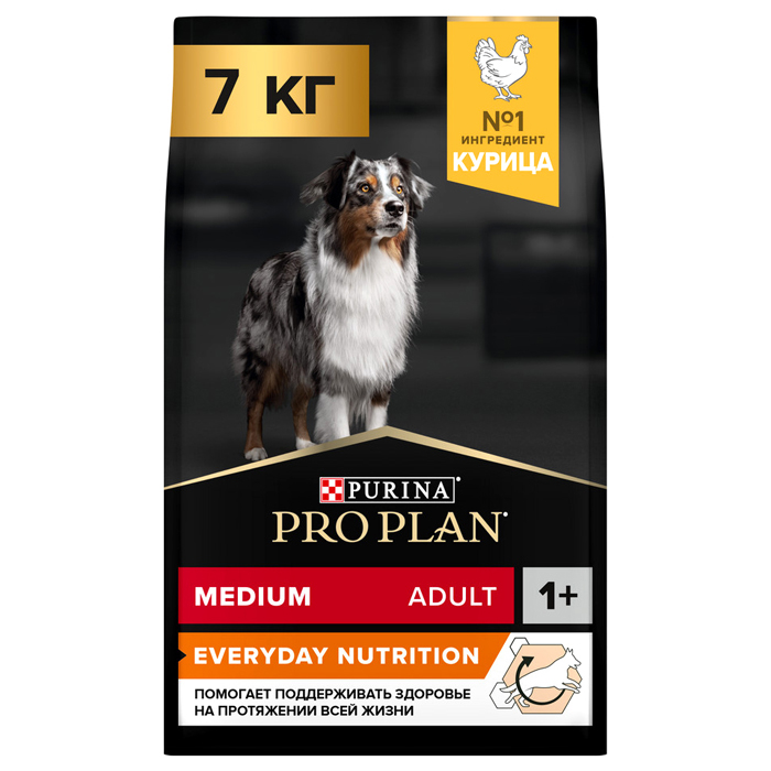 Сухой корм PRO PLAN® EVERYDAY NUTRITION для взрослых собак средних пород, с высоким содержанием курицы, 7кг. Собакам любых пород и размеров важно получать качественное и сбалансированное питание, чтобы сохранять здоровье, поддерживать оптимальный вес и активность. Поэтому ежедневный рацион должен быть сбалансированным и содержать все необходимые питательные вещества, витамины и микроэлементы. Изучая потребности собак на протяжении многих лет, команда квалифицированных ветеринарных специалистов и диетологов PURINA разработала сухой корм PRO PLAN® Everyday Nutrition — ежедневный рацион с высоким содержанием курицы для взрослых собак средних пород. Этот полнорационный корм сбалансирован по составу и помогает поддерживать здоровье вашей собаки на протяжении всей жизни. ПРЕИМУЩЕСТВА: ✔ Обеспечивает высокую усвояемость питательных веществ для удовлетворения потребностей вашей собаки ✔ Сочетание основных питательных веществ помогает поддерживать здоровье суставов вашей собаки при активном образе жизни. Рационы PRO PLAN® разработаны на основе современных научных достижений и рекомендованы ветеринарными специалистами. Ингредиенты № 1 в рационах PRO PLAN® для собак — это всегда высококачественные кусочки ягненка, лосося, курицы и говядины, приготовленные таким образом, чтобы сохранить вкус и важнейшие питательные вещества. Корм сухой для взрослых собак средних пород PRO PLAN® Everyday Nutrition (ежедневный рацион) — это полюбившийся PRO PLAN® Opti Balance (Опти Баланс) с новым названием, но с прежним составом и качеством.