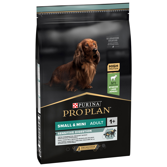 Сухой корм PRO PLAN® SENSITIVE DIGESTION для взрослых собак мелких и карликовых пород с чувствительным пищеварением, с высоким содержанием ягненка, 7кг. Чувствительное пищеварение - одна из самых часто встречающихся особенностей организма собак, когда они не могут нормально усваивать рацион, не вызывающий проблем у других животных. В результате неправильно подобранного питания у собак могут возникнуть нарушения работы желудочно-кишечного тракта, вздутие живота, диарея, метеоризм. Поэтому для питомцев с чувствительным пищеварением важно подобрать специальный корм, который легко усваивается и переваривается, а также способствует улучшению баланса микрофлоры кишечника. Изучая потребности собак на протяжении многих лет, команда квалифицированных ветеринарных специалистов и диетологов PURINA разработала сухой корм PRO PLAN® Sensitive digestion (для чувствительного пищеварения) — ежедневный рацион с высоким содержанием ягненка для взрослых собак мелких и карликовых пород. Этот полнорационный корм сбалансирован по составу и помогает поддержать здоровое пищеварение. ПРЕИМУЩЕСТВА: ✔ Содержит пребиотики, способствующие росту бифидобактерий для улучшения баланса микрофлоры кишечника ✔ Содержит особые ингредиенты для поддержания здоровья кишечника и качества стула ✔ Разработан для уменьшения образования зубного камня, поддерживает гигиену полости рта. Рационы PRO PLAN® разработаны на основе современных научных достижений и рекомендованы ветеринарными специалистами. Ингредиенты № 1 в рационах PRO PLAN® для собак — это всегда высококачественные кусочки ягненка, лосося, курицы и говядины, приготовленные таким образом, чтобы сохранить вкус и важнейшие питательные вещества. Московская ветеринарная академия им. К. И. Скрябина признаёт экспертизу компании «Нестле» в области кормления домашних животных. Корм сухой для взрослых собак мелких и карликовых пород PRO PLAN® Sensitive digestion (для чувствительного пищеварения) — это полюбившийся PRO PLAN® Opti Digest (Опти Дайджест) с новым названием, но с прежним составом и качеством.