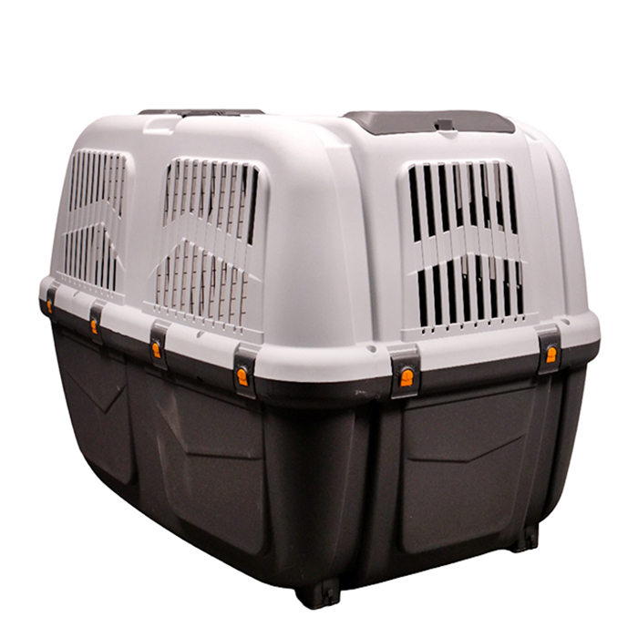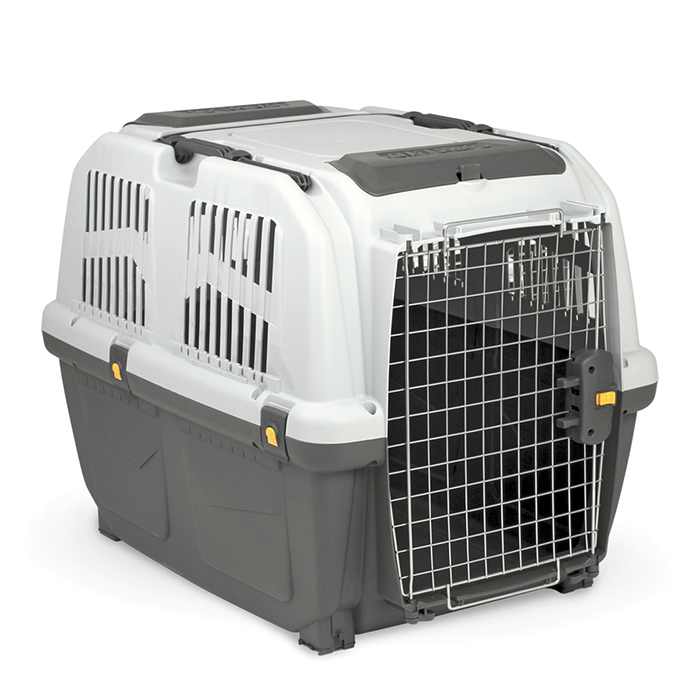 Переноска (транспортный бокс) MPS SKUDO 6 для собак крупных пород, с металлической дверцей и замком, серая, 92*63*h70см. Переноска прекрасно подходит для транспортировки собак крупных пород. Металлическая дверца и поддон крепятся к корпусу современными замками-защелками, что обеспечивает безопасность питомца во время поездок. Благодаря специальным ножкам на поддоне положение питомца в переноске всегда будет устойчивым, а дно изделия не будет царапаться. Раскладная ручка позволит вам выбрать удобное положение, а два небольших дополнительных отделения-кармана - положить необходимые документы и аксессуары. Максимально допустимый вес животного для данной переноски 40 кг. Соответствует стандартам авиа (багажное отделение) перевозок.
