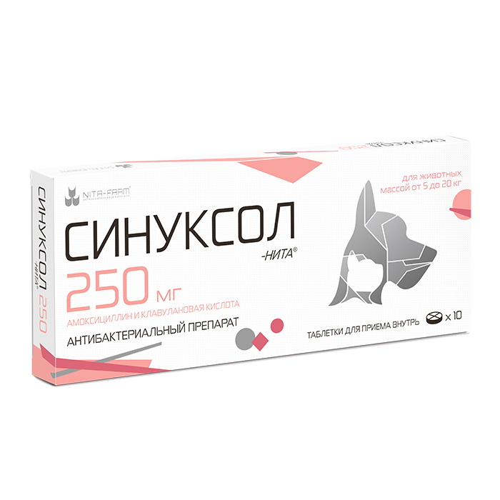 СИНУКСОЛ - НИТА 250мг препарат антибактериальный для лечения собак и кошек, 10табл, NITA-FARM