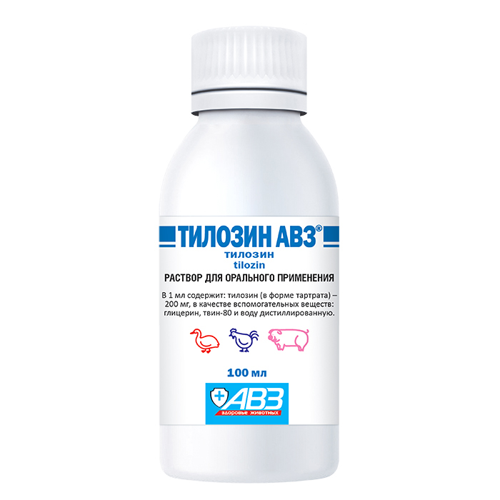 ТИЛОЗИН антибактериальный препарат, флакон 100мл. назначают свиньям при дизентерии, гастроэнтероколитах бактериальной этиологии и энзоотической пневмонии; сельскохозяйственной птице (бройлеры, ремонтный молодняк, племенная птица, индейки) – при респираторном микоплазмозе, инфекционном синусите, аэросаккулите, колибактериозе, пастереллезе, смешанных инфекциях, вторичных бактериальных инфекциях при вирусных болезнях и других заболеваниях, возбудители которых чувствительны к тилозину.