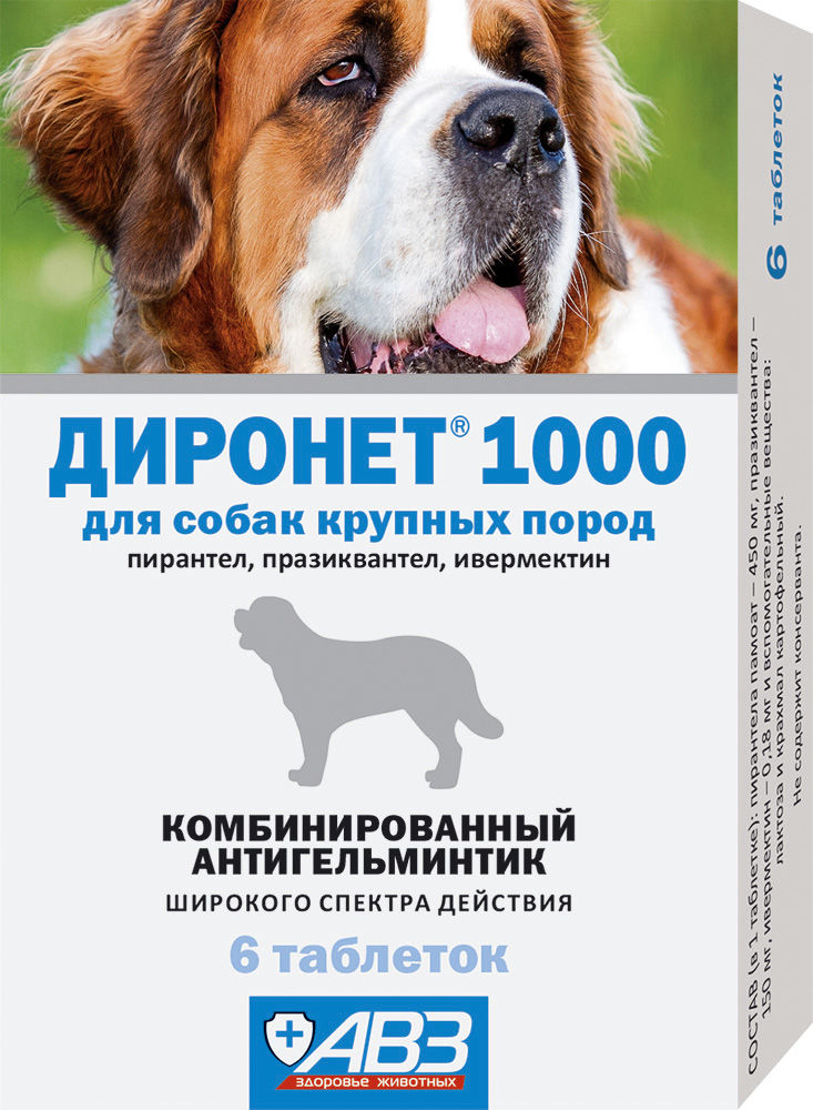 ДИРОНЕТ 1000 антигельминтный препарат для собак крупных пород, упаковка 6 табл. АВЗ