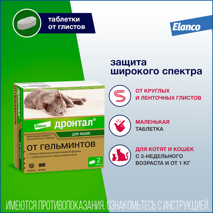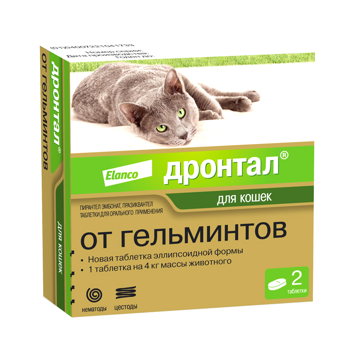 Дронтал®, таблетки от глистов для кошек – препарат от компании Elanco, помогающий избавить вашего питомца от самых распространенных внутренних паразитов – круглых и ленточных гельминтов. Дронтал® выпускается в виде небольшой овальной таблетки с удобной дозировкой – 1 таблетка на 4 кг массы животного, подходит для кошек с 1 кг веса. Разрешен всем породам кошек. Характеристики: ✅ широкий спектр действия – круглые и ленточные гельминты ✅ небольшая таблетка овальной формы ✅ разрешен для всех пород кошек ✅ для котят и кошек с 1 кг веса ✅ для котят с 3-недельного возраста ✅ в упаковку вложены наклейки для паспорта животного ✅ срок годности 5 лет. Показания: Дронтал® – антигельминтик широкого спектра, действующий на: различные виды круглых (токсокары, токсоскары, анкилостомы) гельминтов, различные виды ленточных (дипилидии, тении, эхинококки и др.) гельминтов. Действующие вещества: