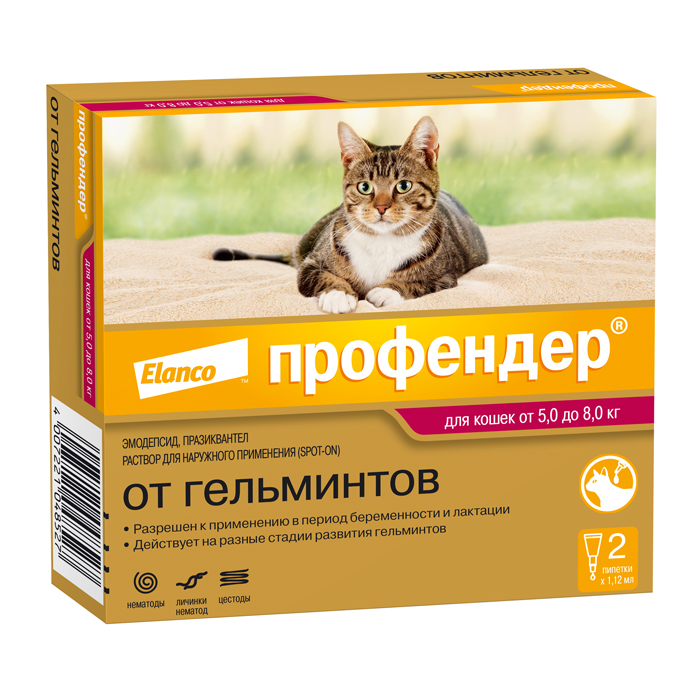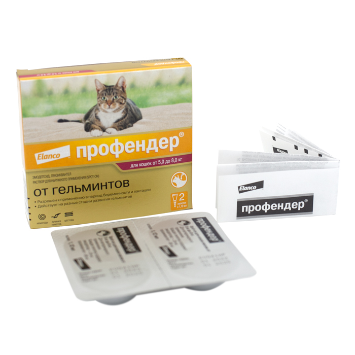 Профендер®, капли на холку от глистов для кошек от 5 до 8кг – 2 пипетки. Профендер®, капли на холку от гельминтов для кошек - новый взгляд на обработку кошек от глистов: помогает комфортно и без лишнего стресса избавлять вашего питомца от внутренних паразитов путем нанесения препарата на кожу в области основания шеи. Профендер® имеет удобную дозировку по весу животного, его можно использовать котятам с 8-недельного возраста, беременным и кормящим кошкам. Препарат от компании Elanco, производится в Германии. Характеристики: ✅ капли на холку от глистов для котят и кошек ✅ широкий спектр действия – от самых распространенных видов глистов (круглых и ленточных) и против редких, но опасных видов – глистов, поражающих легкие и бронхи кошек ✅ действуют на взрослых паразитов и на личинки, в том числе на мигрирующие по организму ✅ обработка без стресса – капли в удобной пипетке для нанесения на холку ✅ для котят и кошек весом от 5 до 8кг ✅ разрешен котятам с 8-ми недель и/или 500 г веса, беременным и кормящим кошкам ✅ срок годности 3 года ✅ продукт компании Elanco, производится в Германии. Показания: Профендер® – антигельминтик в виде капель на холку широкого спектра, действующий на: