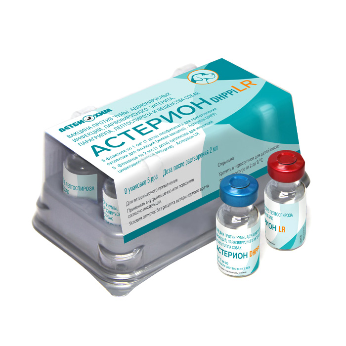 АСТЕРИОН DHРPiLR вакцина против чумы, парвовирусного энтерита, аденовирусных инфекций, парагриппа, лептоспироза и бешенства собак, 1доза. Вакцина состоит из сухого и жидкого компонентов: сухой компонент (живая вакцина) изготовлен из аттенуированных производственных штаммов вируса чумы собак, аденовируса собак типа 2, парвовируса собак и вируса парагриппа собак; жидкий компонент (инактивированная вакцина) изготовлен из производственных инактивированных штаммов лептоспир серогрупп Icterohaemorrhagiae, Canicola и Grippotyphosa с адъювантом. Жидкий компонент является растворителем сухого компонента вакцины. ПРИМЕНЕНИЕ: Запрещено вакцинировать клинически больных и/или ослабленных животных. МЕТОД ВАКЦИНАЦИИ: Вакцину вводят щенкам двукратно в 8-10-недельном возрасте с интервалом 21-28 сут. внутримышечно в область бедра или подкожно в область шеи в дозе 2,0 мл. Ревакцинацию щенков проводят в возрасте 10-12 месяцев. Собак мелких и декоративных пород прививают в дозе 1,0 мл. Взрослых собак вакцинируют один раз в год в дозе 2,0 мл. Сухой компонент вакцины растворяют в 2,0 мл прилагаемого жидкого компонента. При применении исключают выпадение компонентов вакцины в осадок. При наличии незначительного не разбивающегося осадка вакцину 3-5 раз пипетируют во флаконе с помощью шприца до получения равномерной гомогенной суспензии. Вакцинацию проводят с соблюдением правил асептики, для инъекции используют только стерильные материалы и инструменты. ИММУНИТЕТ: Вакцина вызывает формирование иммунного ответа у собак к чуме, аденовирусным инфекциям, парвовирусному энтериту, парагриппу, лептоспирозу и бешенству через 2-3 недели после иммунизации, продолжительностью у молодняка 6-8 месяцев, у взрослых – 12-15 месяцев. Вакцина безвредна и ареактогенна, лечебными свойствами не обладает. Форма выпуска: Сухой и жидкий компоненты вакцины расфасованы соответственно по 1,0 см3 (1 доза) и 2,0 мл (1 доза) во флаконы или ампулы вместимостью 3,0 мл. Срок годности: 18 месяцев при соблюдении условий хранения и транспортирования (в сухом темном месте, при температуре от 2 до 8°С). Перед использованием вакцины необходимо внимательно ознакомится с инструкцией по применению.