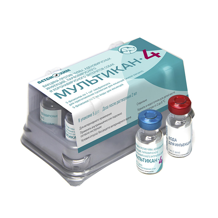 МУЛЬТИКАН-4 вакцина против чумы, аденовирусных инфекций, парвовирусного и коронавирусного энтеритов собак, 1 доза. Вакцина состоит из сухого и жидкого компонентов: сухой компонент (живая вакцина) изготовлен из аттенуированных производственных штаммов вируса чумы собак, аденовируса собак типа 2, парвовируса и коронавируса собак; жидкий компонент – вода для инъекций. Жидкий компонент является растворителем сухого компонента вакцины. ПРИМЕНЕНИЕ: Запрещено вакцинировать клинически больных и/или ослабленных животных. МЕТОД ВАКЦИНАЦИИ: Вакцину вводят щенкам двукратно в 8-10-недельном возрасте с интервалом 21-28 сут. внутримышечно или подкожно в область шеи в дозе 2,0 мл. Ревакцинацию щенков проводят в возрасте 10-12 месяцев. Собак мелких и декоративных пород прививают в дозе 1 мл. Взрослых собак вакцинируют один раз в год в дозе 2 мл. Сухой компонент вакцины растворяют в 2 мл прилагаемого жидкого компонента. При наличии незначительного не разбивающегося осадка вакцину 3-5 раз пипетируют во флаконе с помощью шприца до получения равномерной гомогенной суспензии. Вакцинацию проводят с соблюдением правил асептики, для инъекции используют только стерильные материалы и инструменты. ИММУНИТЕТ: Вакцина вызывает формирование иммунного ответа у собак к чуме, аденовирусным инфекциям, парвовирусному и коронавирусному энтеритам через 2-3 недели после иммунизации, продолжительностью у молодняка 6-8 месяцев, у взрослых – 12-15 месяцев.