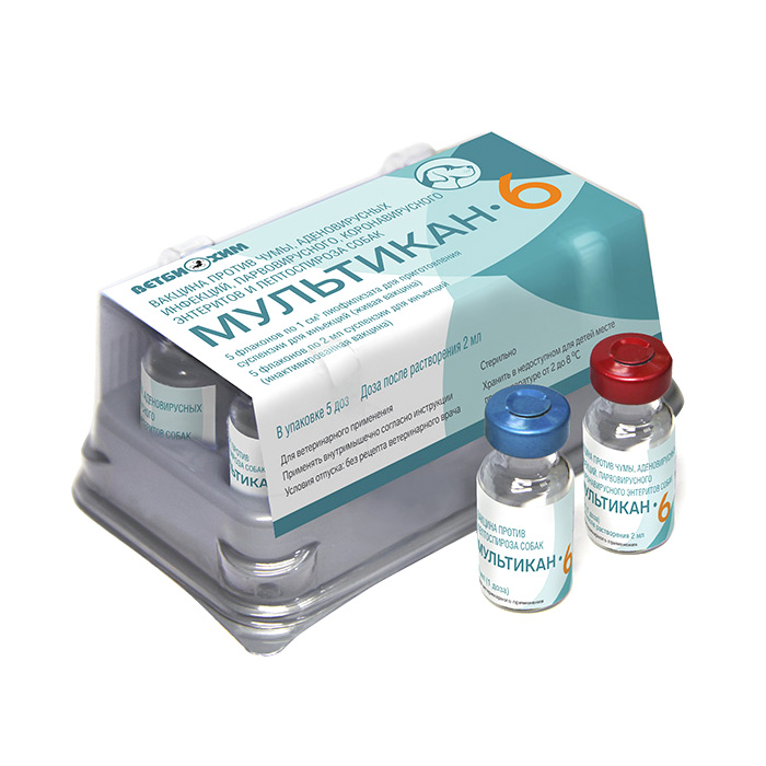 МУЛЬТИКАН-6 вакцина против чумы, аденовирусных инфекций, парвовирусного, коронавирусного энтеритов и лептоспироза собак. Вакцина состоит из сухого и жидкого компонентов: сухой компонент (живая вакцина) изготовлен из аттенуированных производственных штаммов вируса чумы собак, аденовируса собак типа 2, парвовируса и коронавируса собак; жидкий компонент (инактивированная вакцина) изготовлен из производственных инактивированных штаммов лептоспир серогрупп Icterohaemorrhagiae, Canicola и Grippotyphosa с адъювантом. Жидкий компонент является растворителем сухого компонента вакцины. ПРИМЕНЕНИЕ: Запрещено вакцинировать клинически больных и/или ослабленных животных. МЕТОД ВАКЦИНАЦИИ: Вакцину вводят щенкам двукратно в 8-10-недельном возрасте с интервалом 21-28 сут. внутримышечно в область бедра в дозе 2,0 мл. Ревакцинацию щенков проводят в возрасте 10-12 месяцев. Собак мелких и декоративных пород прививают в дозе 1 мл. Взрослых собак вакцинируют один раз в год в дозе 2 мл.