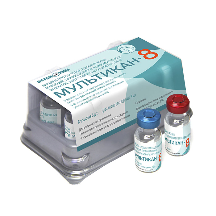 МУЛЬТИКАН-8 вакцина против чумы, аденовирусных инфекций, парвовирусного и коронавирусного энтеритов, лептоспироза и бешенства собак, 1доза. Вакцина состоит из сухого и жидкого компонентов: сухой компонент (живая вакцина) изготовлен из аттенуированных производственных штаммов вируса чумы собак, аденовируса собак типа 2, парвовируса и коронавируса собак; жидкий компонент (инактивированная вакцина) изготовлен из производственных инактивированных штаммов лептоспир серогрупп Icterohaemorrhagiae, Canicola и Grippotyphosa, производственного инактивированного штамма вируса бешенства с адъювантом. Жидкий компонент является растворителем сухого компонента вакцины. ПРИМЕНЕНИЕ: Запрещено вакцинировать клинически больных и/или ослабленных животных. МЕТОД ВАКЦИНАЦИИ: Вакцину вводят щенкам двукратно в 8-10-недельном возрасте с интервалом 21-28 сут. внутримышечно в область бедра в дозе 2,0 мл. Ревакцинацию щенков проводят в возрасте 10-12 месяцев. Собак мелких и декоративных пород прививают в дозе 1 мл. Взрослых собак вакцинируют один раз в год в дозе 2 мл. Сухой компонент вакцины растворяют в 2 мл прилагаемого жидкого компонента. При применении исключают выпадение компонентов вакцины в осадок. При наличии незначительного не разбивающегося осадка вакцину 3-5 раз пипетируют во флаконе с помощью шприца до получения равномерной гомогенной суспензии. Вакцинацию проводят с соблюдением правил асептики, для инъекции используют только стерильные материалы и инструменты. ИММУНИТЕТ: Вакцина вызывает формирование иммунного ответа у собак к чуме, аденовирусным инфекциям, парвовирусному, коронавирусному энтеритам, лептоспирозу и бешенству через 2-3 недели после иммунизации, продолжительностью у молодняка 6-8 месяцев, у взрослых – 12-15 месяцев. Вакцина безвредна и ареактогенна, лечебными свойствами не обладает. Форма выпуска: Сухой и жидкий компоненты вакцины расфасованы соответственно по 1,0 см3 (1 доза) и 2,0 мл (1 доза) во флаконы или ампулы вместимостью 3,0 мл. Срок годности: 18 месяцев при соблюдении условий хранения и транспортирования (в сухом темном месте, при температуре от 2 до 8°С). Перед использованием вакцины необходимо внимательно ознакомится с инструкцией по применению.