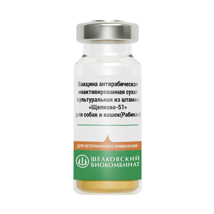 НАЗНАЧЕНИЕ: Профилактическая и вынужденная иммунизация собак и кошек против бешенства. ОПИСАНИЕ: Сухая пористая масса желтовато-коричневого цвета, растворимая в дистиллированной воде. ХАРАКТЕРИСТИКИ: Препарат представляет собой инактивированный β- пропиолактоном вирус бешенства штамма «Щелково-51», лиофилизированного в защитной среде. У первично вакцинированных животных иммунитет начинает формироваться с 5-7 суток после однократного введения вакцины, достигает своего максимума к 30-40 суткам и сохраняется в течение одного года. После вторичной вакцинации, проведенной через 30-50 суток, защитная реакция организма усиливается, и напряженный иммунитет сохраняется в течение двух лет. Иммуногенная активность вакцины не менее 1 МЕ/см3. ДОЗИРОВКА И ПРИМЕНЕНИЕ: Перед применением сухую вакцину восстанавливают до исходного объема, указанного на этикетке, стерильной дистиллированной водой (разбавителем). Профилактическую иммунизацию проводят с 2-месячного возраста однократно с последующей ревакцинацией через один год, и в дальнейшем - одни раз в два года. ДОЗЫ: