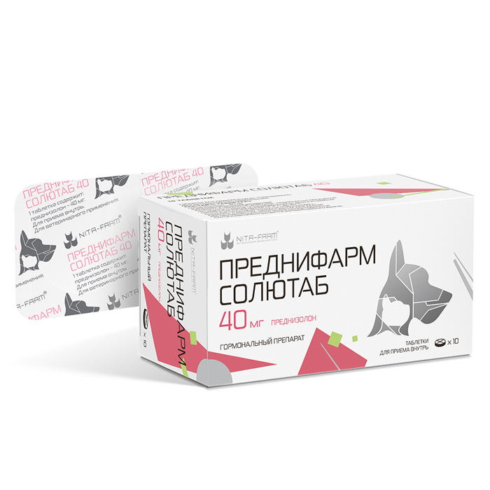 Преднифарм Солютаб, 40мг, 10таб. Ветеринарные таблетки преднизолона в специальных дозировках для кошек и собак с учетом веса животных с привлекательным запахом и нейтральным вкусом. ФАРМАКОЛОГИЧЕСКИЕ СВОЙСТВА: Преднизолон, входящий в состав препарата, синтетическое глюкокортикоидное средство, дегидрированный аналог гидрокортизона. Оказывает противовоспалительное, противоаллергическое, иммунодепрессивное действие, противозудное, антиэкссудативное действие, повышает чувствительность бета-адренорецепторов к эндогенным катехоламинам. ПОКАЗАНИЯ: Преднифарм Солютаб применяют собакам и кошкам: при заболеваниях кожи различного генеза (в том числе экземе, атопическом дерматите, токсидермии, пиодермии и других дерматитах); при воспалительных процессах различного генеза (в том числе артритах, артрозах, синовитах, бурситах, грыжах межпозвоночных дисков и других воспалительных процессах опорно-двигательного аппарата); при системных заболеваниях соединительной ткани в том числе ревматизме; при острых инфекционных заболеваниях (в комбинации с антимикробными средствами); при бронхиальной астме, астматическом статусе животного; при аллергических реакциях, анафилактоидных реакциях, сывороточной болезни; при аутоиммунной гемолитической анемии, апластической анемии, тромбоцитопении, надпочечниковой недостаточности, прогрессирующей офтальмопатии; при стрессовых (выставки, тренировки) состояниях; при некоторых онкологических заболеваниях (лейкозе, лимфоме, мастоцитоме и др.). ПРИМЕНЕНИЕ: Преднифарм Солютаб применяют кошкам и собакам перорально индивидуально, в смеси с кормом или в форме водной суспензии. Доза препарата, кратность и продолжительность курса лечения устанавливается ветеринарным специалистом индивидуально в зависимости от показаний, тяжести заболевания и состояния животного. В некоторых случаях возможно длительное применение препарата. Для удобства задачи минимальной дозировки препарата животным с низкой массой тела возможно предварительно растворить таблетку или часть таблетки в небольшом количестве воды. В таком виде задают необходимую дозировку препарата перорально в форме суспензии с помощью шприца-дозатора или стандартного шприца для инъекций без иглы. Наиболее удобным является применение: ● Преднифарм Солютаб 4мг - животным массой тела до 8 кг ● Преднифарм Солютаб 16мг - животным массой тела от 8 до 20 кг ● Преднифарм Солютаб 40мг - животным массой тела от 20 кг.