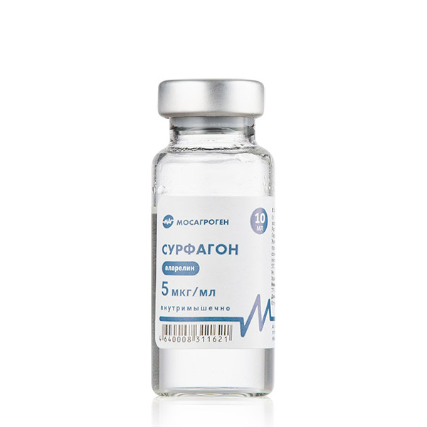 Состав: Сурфагон в 1 мл в качестве действующего вещества содержит аларелина ацетат (в пересчете на аларелин) 5 мкг, вспомогательные вещества: хлорид натрия, нипагин, а также воду для инъекций.