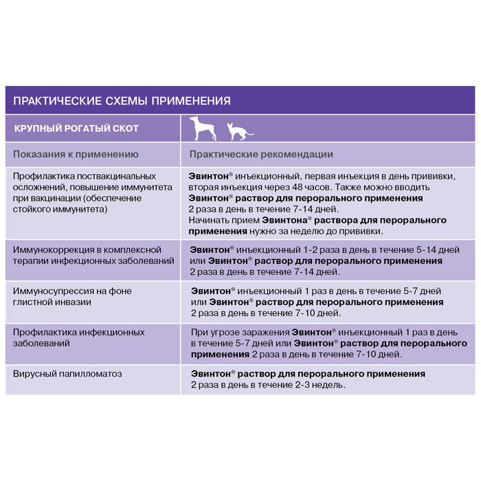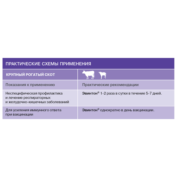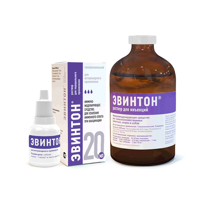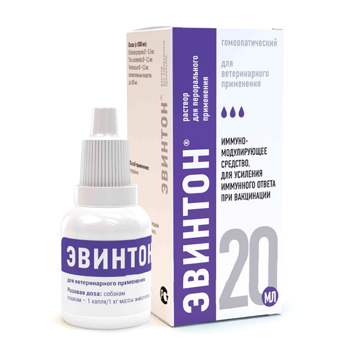 Эвинтон – иммуномодулятор для животных. Раствор для перорального применения. АКТИВНЫЕ КОМПОНЕНТЫ: Echinacea purpurea, Thuja occidentalis, Vincetoxicum. ФАРМАКОЛОГИЧЕСКИЕ СВОЙСТВА: Оказывает неспецифическое иммуномодулирующее действие, стимулирует иммунный ответ при вакцинации, активирует неспецифическую резистентность организма. ПОКАЗАНИЯ К ПРИМЕНЕНИЮ: Неспецифическая профилактика и лечение респираторных и желудочно-кишечных заболеваний инфекционной этиологии. Коррекция иммунного статуса, в том числе при аллергических и аутоиммунных состояниях. Профилактика поствакцинальных осложнений и повышение иммунитета при вакцинации. СПОСОБ ПРИМЕНЕНИЯ, РАЗОВЫЕ ДОЗЫ: Раствор для перорального применения: внутрь. Разовая доза на одно животное составляет: собакам, кошкам – 1 капля/1 кг массы животного. ФОРМА ВЫПУСКА: Раствор для перорального применения в полимерных флаконах по 20 мл. УСЛОВИЯ ХРАНЕНИЯ Хранить в закрытой упаковке производителя, отдельно от продуктов питания и кормов, в защищенном от прямых солнечных лучей месте при температуре 0 до 30 °С. Срок годности: в закрытой упаковке производителя 3 года с момента производства, после первого вскрытия флакона – 30 дней.