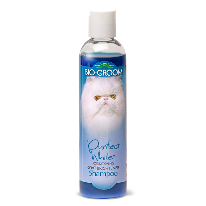 Bio-Groom Purrfect White Shampoo кондиционирующий шампунь для кошек белого и светлых окрасов 237 мл. Шампунь специально создан для кошек со светлым окрасом шерсти. Входящее в его состав кокосовое масло увлажняет и отбеливает шерсть, придавая ей бриллиантовое сияние. Впитывающийся протеин делает шерсть более объёмной и предупреждает её спутывание. Не содержит химических красителей.