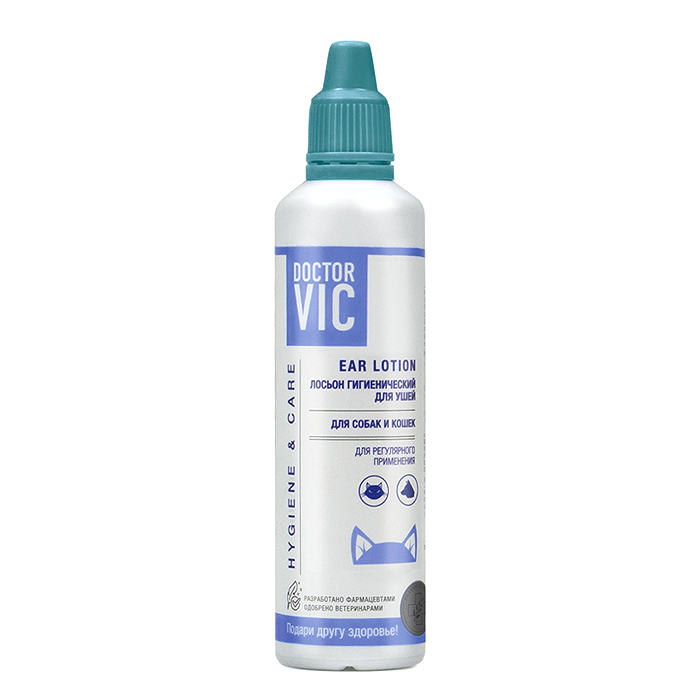 Лосьон гигиенический Doctor VIC для ушей собак и кошек, 60мл. Подходит для регулярного эффективного очищения наружного слухового прохода у собак и кошек. ПРЕИМУЩЕСТВА: ✔ Оказывает противовоспалительное, ранозаживляющее действие ✔ Восстанавливает структуру и повышает резистентность кожи ушной раковины ✔ Мягко и эффективно растворяет скопление ушной серы и удаляет загрязнения в наружном слуховом проходе. Продукт устраняет неприятные запахи, поддерживает микрофлору и местный иммунитет, сокращает количество патогенных бактерий и грибов. Экстракт календулы восстанавливает структуру кожи, повышает ее эластичность и резистентность, оказывает антисептическое, бактерицидное противовирусное, ранозаживляющее действие. ПРИМЕНЕНИЕ: Поднести наконечник бутылочки к ушной раковине и слегка нажать для поступления лосьона, мягко помассировать основание уха. Жидкость удалить ватным тампоном, от остатков лосьона и ушной серы животное освободится самостоятельно при встряхивании головой. При лечении заболеваний ушей применять перед каждым введением лекарственного средства. Для гигиенического ухода за ушами – один раз в 7- 10 дней. Необходимо соблюдать меры предосторожности при использовании ватных палочек для очищения наружного слухового прохода во избежание его повреждения.