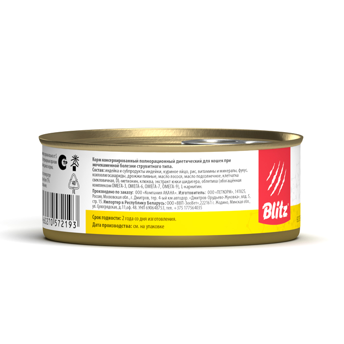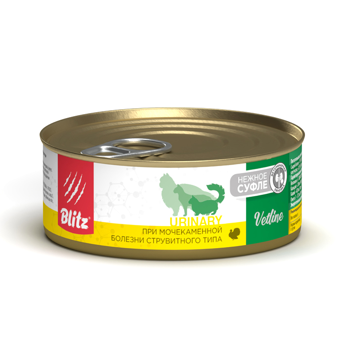 BLITZ Vetline Urinary. Консервированный полнорационный диетический корм для кошек при мочекаменной болезни струвитного типа, суфле с индейкой, 100г. Ветеринарная диета показана при МКБ струвитного типа у кошек. Способствует растворению струвитных мочевых камней и снижающий риск их повторного образования.