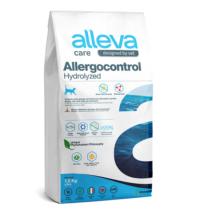 Alleva Care Cat Allergocontrol, 1,5кг. Полнорационный сухой диетический корм для кошек всех возрастов. Благодаря соответствующему сочетанию основных питательных свойств, корм предназначен для снижения пищевой непереносимости к определенным ингредиентам или питательным веществам. Рекомендуется также в качестве поддержки функции кожи и ее производных в случае дерматоза и чрезмерного выпадения шерсти. ОБЩИЕ ХАРАКТЕРИСТИКИ: Для ограничения реакций иммунной системы в корме Alleva Care Allergocontrol в качестве единственного источника белка используется гидролизованная сельдь с низким молекулярным весом (70% ниже 2 000 дальтон, максимально 6 000 дальтон), а в качестве углеводов используется картофельный крахмал, прошедший тщательную очистку от белковой составляющей. Высокая концентрация незаменимых жирных кислот (линолевая кислота, эйкозапентаеновая кислота (EPA) и докозагексаеновая кислота (DHA)) из жира сельди и масла подсолнечника поддерживает здоровье кожи и уменьшает воспаление. Очищенный Алоэ вера способствует укреплению общей резистентности организма, стимулирует процессы регенерации кожи и эпителиальный трофизм. РЕКОМЕНДАЦИИ ПО ПРИМЕНЕНИЮ: Перед началом и для продления срока использования рекомендуется проконсультироваться с ветеринарным специалистом. Корм готов к употреблению. Рекомендуемая дневная норма кормления указана в таблице и имеет ориентировочный характер. В случае дерматоза и выпадения шерсти использовать изначально до 2 месяцев.В случае непереносимости или аллергии рекомендованный период использования: от 3 до 8 недель. При полном исчезновении симптомов пищевой непереносимости корм Alleva Care Allergocontrol может использоваться как постоянное питание на протяжении одного года. Дневная норма может меняться в зависимости от породы, темперамента, условий содержания и уровня активности. Кошка всегда должна иметь свободный доступ к свежей питьевой воде.