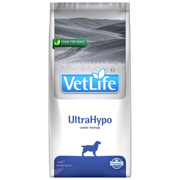FARMINA VET LIFE ULTRAHYPO CANINE. Диетический сухой корм для собак, разработанный для снижения пищевой непереносимости питательных веществ, в случаях пищевой аллергии и атопий. Используется в качестве диагностического инструмента (исключающая диета). Диета также показана при атопических дерматитах и воспалительных состояниях кишечника. Упаковка 12кг.