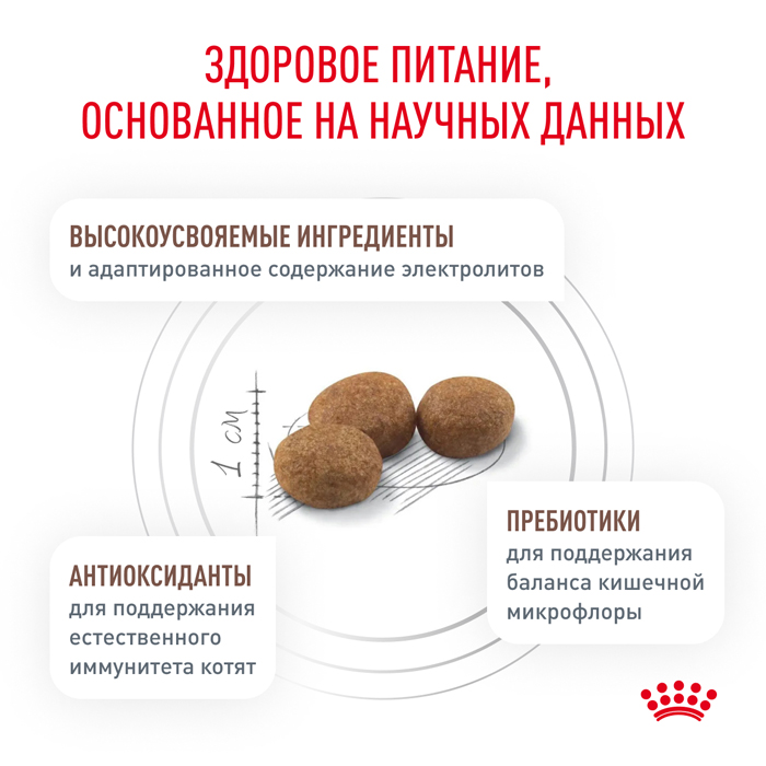 ROYAL CANIN® GASTROINTESTINAL KITTEN – сухой полнорационный диетический корм для котят в возрасте от 2 до 10 месяцев, рекомендуемый при острых расстройствах пищеварения, в реабилитационный период и при истощении. Показания: Острая и хроническая диарея. Гастрит. Воспалительные заболевания кишечника (ВЗК). Колит. Чрезмерный рост бактериальной флоры в тонком кишечнике. Синдром мальдигестии/мальабсорбции. Снижение аппетита, возобновление кормления после операции. Преимущества: Поддержание здоровья пищеварительной системы: высокоусвояемая формула, содержащая сбалансированный комплекс разных видов клетчатки, в том числе пребиотики, способствует поддержанию здорового пищеварения и оптимального качества стула. Дополнительное количество электролитов и высокое содержание основных питательных веществ. Высокая калорийность. Формула с высоким содержанием энергии и адаптированным уровнем питательных веществ (включая белок и кальций) удовлетворяет потребности растущих котят. Крокеты, которые легко размачивать, стимулируют потребление корма котятами с пониженным аппетитом и облегчают переход с молока на твердый корм.