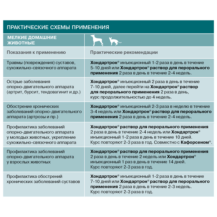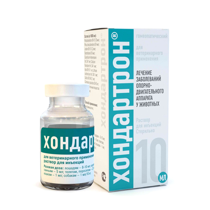 Хондартрон - хондпропротектор, препарат для профилактики и лечения болезней суставов. Раствор для инъекций. АКТИВНЫЕ КОМПОНЕНТЫ: Apis mellifica, Calcium fluoratum, Causticum Hahnemanni, Ledum palustre, Lithium carbo nicum, Rhododendron, Rhus toxicodendron, Sulfur, Symphytum, Сабельника настойка. ПОКАЗАНИЯ К ПРИМЕНЕНИЮ: Острые заболевания суставов и околосуставных структур (артрит, бурсит, синовит и пр.) Заболевания и травмы сухожильно-связочного аппарата (тендинит, тендовагинит, растяжения, частичные разрывы сухожилий и пр.). Остеоартриты, в том числе, как следствие различных остеохондропатий. После операционного вмешательства на суставах и сухожильно-связочном аппарате. ФАРМАКОЛОГИЧЕСКИЕ СВОЙСТВА: Противовоспалительное, анальгетическое, хондропротективное и регенерирующее действие при заболеваниях опорнодвигательного аппарата. Оказывает комплексное действие при заболеваниях суставов. Стимулирует восстановление хрящевой ткани. Подходит для беременных и лактирующих животных. СПОСОБ ПРИМЕНЕНИЯ, РАЗОВЫЕ ДОЗЫ: Раствор для инъекций: подкожно или внутримышечно. Разовая доза на одно животное составляет: собакам – 0,1 мл/1 кг массы животного, кошкам – 0,1 мл/1 кг массы животного (но не менее 0,5 мл). крупному рогатому скоту, свиньям – 5 мл/животное, телятам, поросятам – 2,5 мл/животное, лошадям – 8-10 мл/животное. ФОРМА ВЫПУСКА: Раствор для инъекций в стеклянных флаконах по 10 и 100 мл. УСЛОВИЯ ХРАНЕНИЯ: Хранить в закрытой упаковке производителя, отдельно от продуктов питания и кормов, в защищенном от прямых солнечных лучей месте при температуре 0 до 30 °С. Срок годности: в закрытой упаковке производителя 3 года с момента производства, после первого вскрытия флакона – 21 день.
