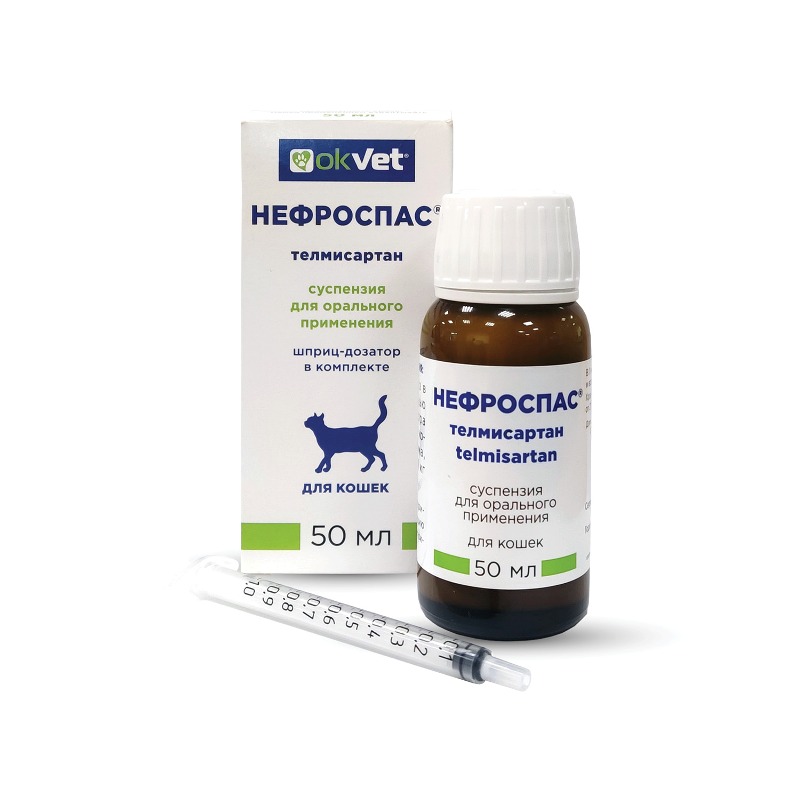 OKVET НЕФРОСПАС препарат для лечения хронической болезни почек (ХБП) у кошек в виде суспензии, 50мл. НЕФРОСПАС® содержит ТЕЛЬМИСАРТАН, который направлен на снижение количества белка, теряемого организмом кошки с мочой. Потеря слишком большого количества белка с мочой может привести к снижению продолжительности жизни кошек, страдающих хронической болезнью почек (ХБП). ПРЕИМУЩЕСТВА: ✔ разработан специально для кошек ✔ улучшает качество жизни кошек с хронической болезнью почек (хбп) ✔ комфортно использовать благодаря шприцу-дозатору в комплекте ✔ удобная схема применения - один раз в сутки ✔ экономичный расход - объема флакона хватает надолго ✔ подходит для пожизненного применения - длительность курса лечения не ограничена. ФАРМАКОЛОГИЧЕСКИЕ СВОЙСТВА: Телмисартан, входящий в состав лекарственного препарата вызывает дозозависимое снижение артериального кровяного давления у млекопитающих, в том числе у кошек с хронической болезнью почек, и постепенное уменьшение протеинурии. При пероральном применении лекарственного препарата кошкам телмисартан быстро всасывается в системный кровоток. Абсолютная биодоступность после перорального приема составляет около 33%, связывание с белками плазмы (преимущественно с альбумином и ɑ-1-кислотным гликопротеином), более 99%. Являясь липофильным соединением, телмисартан хорошо проникает в органы и ткани. При длительном применении (в течение 21 дня) клинически значимого накопления телмисартана в органах и тканях не наблюдается. ПОКАЗАНИЯ К ПРИМЕНЕНИЮ: Нефроспас® назначают для снижения уровня нефротоксической протеинурии при хронической болезни почек (ХБП) и лечения сопутствующей системной гипертензии и ХБП у кошек. ПОРЯДОК ПРИМЕНЕНИЯ: Нефроспас® применяют кошкам перорально (внутрь) один раз в сутки, принудительно с помощью шприца-дозатора или с небольшим количеством корма, в дозе 0,1 мл/кг массы животного (соответствует 1 мг телмисартана на 1 кг массы животного). Дозу лекарственного препарата и продолжительность курса лечения определяет лечащий ветеринарный врач в зависимости от физического состояния животного и течения заболевания. Длительность курса лечения не ограничена. ПРОТИВОПОКАЗАНИЯ: Противопоказанием к применению НЕФРОСПАС является гиперчувствительность животного к компонентам препарата, в том числе в анамнезе, холестаз, обструкция желчевыводящих путей, выраженная печеночная недостаточность. С осторожностью препарат назначают при хронической сердечной и печеночной недостаточности, двустороннем стенозе почечных артерий, гиповолемии, гипонатриемии, гиперкалиемии, под периодическим контролем клинического состояния и показателей крови (в том числе уровнем калия, натрия и креатинина в сыворотке).