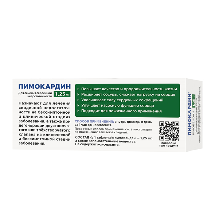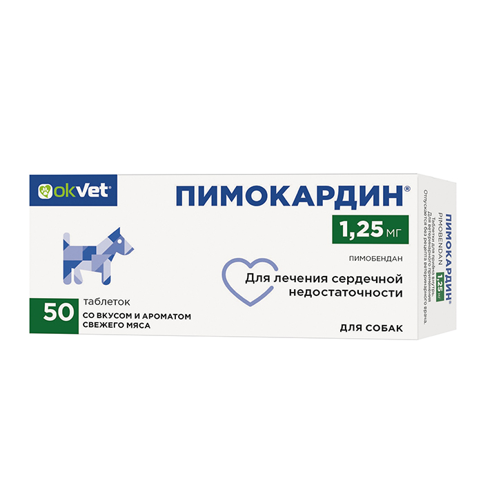 ПИМОКАРДИН 1,25мг, препарат для лечения сердечной недостаточности у собак, 50 таблеток. ДЕЙСТВУЮЩЕЕ ВЕЩЕСТВО: Пимобендан. ПРЕИМУЩЕСТВА: ✔ Расширяет сосуды, снижает нагрузку на сердце ✔ Увеличивает силу сердечных сокращений ✔ Улучшает насосную функцию сердца ✔ Повышает качество и продолжительность жизни питомца ✔ Подходит для пожизненного применения. ФАРМАКОЛОГИЧЕСКИЕ СВОЙСТВА: Пимобендан, входящий в состав лекарственного препарата, является производным бензимидазол-пиридазинона и обладает положительным инотропным и вазодилатирующим (сосудорасширяющим) действием. Препарат повышает силу сердечных сокращений и уменьшает как преднагрузку, так и постнагрузку при сердечной недостаточности собак. ПОКАЗАНИЯ К ПРИМЕНЕНИЮ: ПИМОКАРДИН® назначают собакам для лечения сердечной недостаточности, вызванной дилатационной кардиомиопатией (ДКМП) на бессимптомной (предклинической) и клинической стадиях заболевания, а также при миксоматозной дегенерации двустворчатого или трёхстворчатого клапана на клинической стадии и миксоматозной дегенерации митрального клапана на бессимптомной (предклинической) стадии заболевания. ДОЗЫ И ПОРЯДОК ПРИМЕНЕНИЯ: ПИМОКАРДИН® задают животным перорально (внутрь) за 1 час до кормления. Доза препарата и продолжительность применения назначается ветеринарным врачом в зависимости от тяжести течения заболевания и состояния животного. Суточная доза пимобендана (действующего вещества) составляет от 0,2 мг до 0,6 мг на 1 кг массы животного и делится на два приема. Рекомендованная доза для достижения клинического эффекта - 0,5 мг/кг массы животного в сутки. Рекомендуемые дозы препарата в зависимости от массы животного представлены в таблице в инструкции. Для более точного определения дозы, соответствующей массе животного, таблетка может быть разделена на половинки. При застойной сердечной недостаточности препарат применяют собакам пожизненно с индивидуальным подбором дозы. ИМЕЮТСЯ ПРОТИВОПОКАЗАНИЯ, ОЗНАКОМЬТЕСЬ С ИНСТРУКЦИЕЙ.