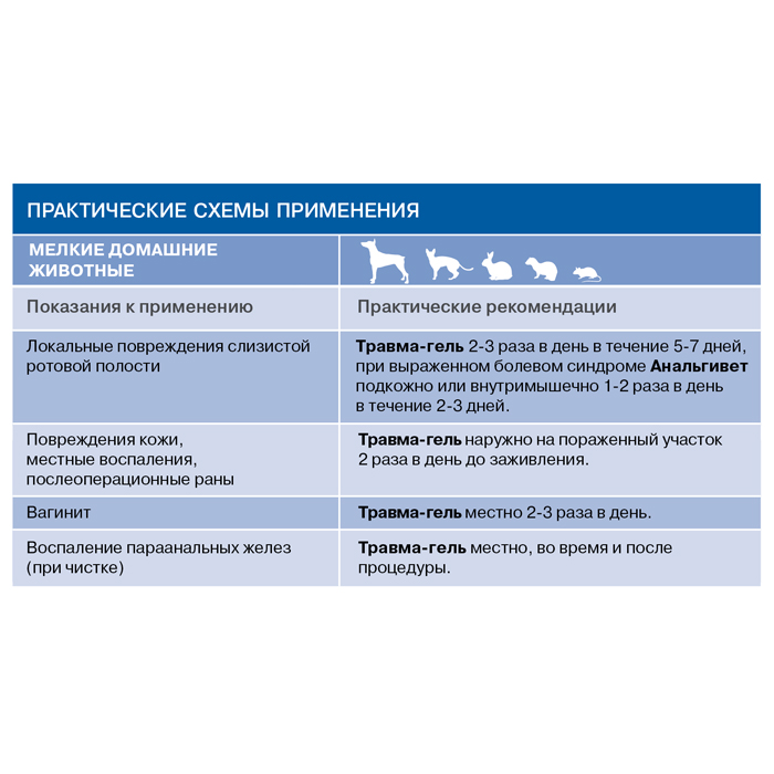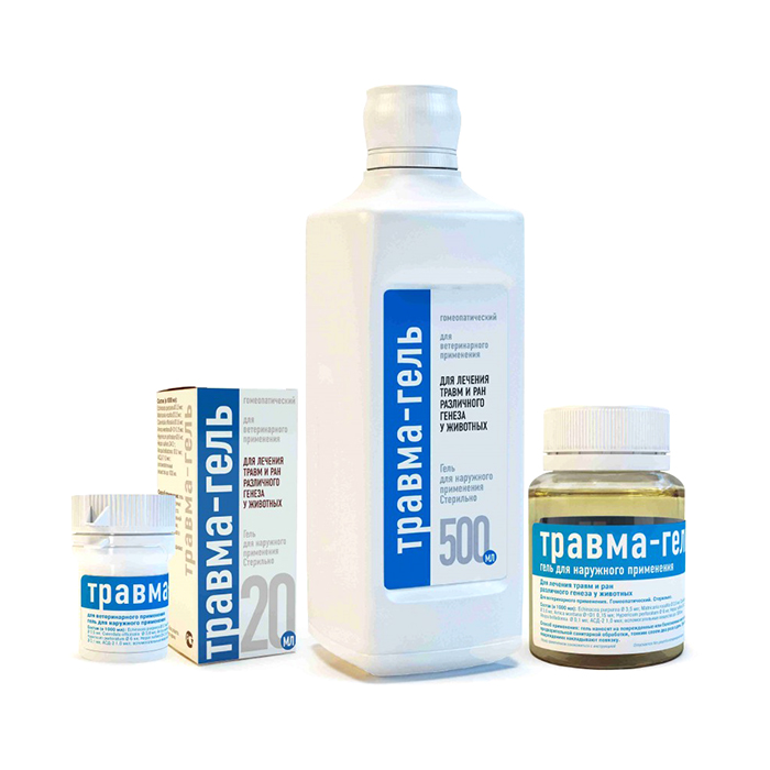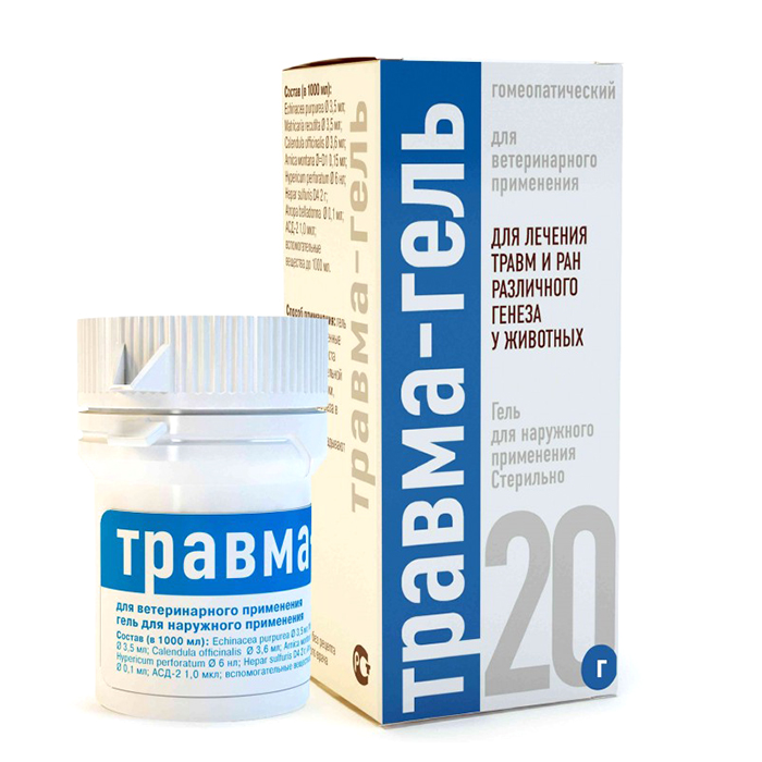 Травма-гель – препарат для заживления ран и поврежденных тканей. Для наружного применения. АКТИВНЫЕ КОМПОНЕНТЫ: Arnica мontana, Atropa belladonna, Calendula officinalis, Echinacea purpurea, Hepar sulfuris, Hypericum perforatum, Matricaria recutita, АСД фракция 2. ПОКАЗАНИЯ К ПРИМЕНЕНИЮ: Лечение различных повреждений кожи и слизистых, в том числе ран различного генеза, ссадин, порезов, ожогов, повреждений подушечек лап при контакте с солевыми реагентами, травм вымени. Обработка послеоперационных ран. Острые кожные воспаления (дерматиты, маститы и пр.). Подходит для беременных, лактирующих и новорожденных животных. ФАРМАКОЛОГИЧЕСКИЕ СВОЙСТВА: Оказывает противовоспалительное действие, устраняет отек, восстанавливает микроциркуляцию в поврежденных тканях, стимулирует регенерацию. СПОСОБ ПРИМЕНЕНИЯ, РАЗОВЫЕ ДОЗЫ: Наружно. Наносить на поражённый участок 1-2 раза в день. ФОРМА ВЫПУСКА: Гель для наружного применения в пластиковых флаконах по 20, 75 и 500г. УСЛОВИЯ ХРАНЕНИЯ: Хранить в закрытой упаковке производителя, отдельно от продуктов питания и кормов, в защищенном от прямых солнечных лучей месте при температуре 0 до 30 °С. Срок годности: в закрытой упаковке производителя 2 года с момента производства.