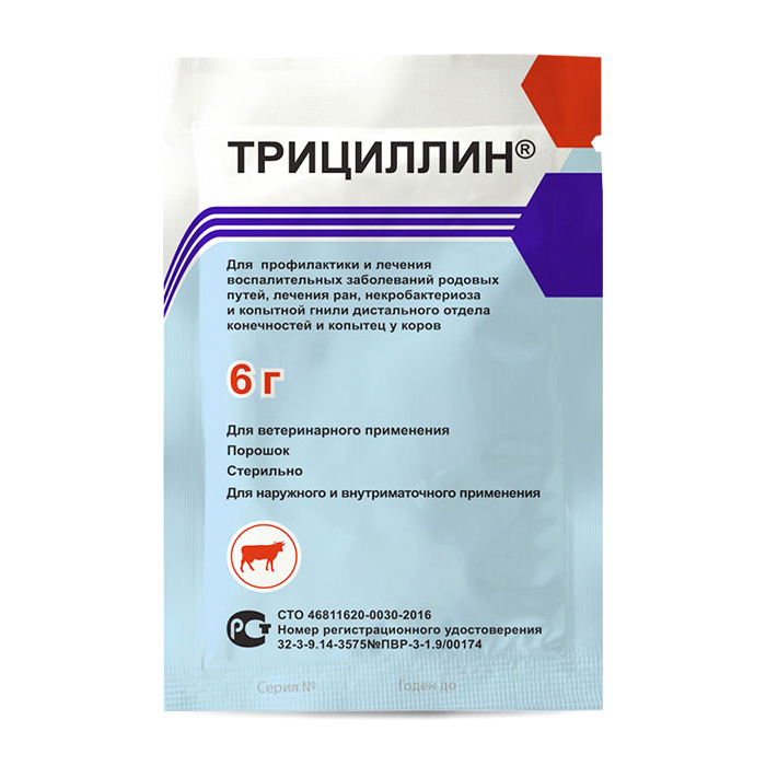ПОКАЗАНИЯ К ПРИМЕНЕНИЮ: Трициллин назначают коровам для профилактики и лечения послеродового эндометрита и других воспалительных заболеваний родовых путей бактериальной этиологии, после оказания родовспоможения, кесарева сечения, оперативного отделения последа, при осложненных родах и травмах родовых путей, а также для лечения ран и в составе комплексной терапии при лечении некробактериоза и копытной гнили дистального отдела конечностей и копытец. ПОРЯДОК ПРИМЕНЕНИЯ: