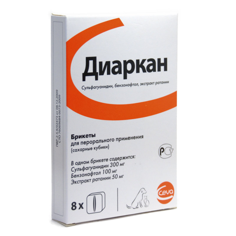 Диаркан – сахарные кубики для лечения диарей у собак и кошек. Действующие вещества: бензонафтол, сульфагуанидин, экстракт жидкости Ратаниа. Сульфагинидин обладает антибактериальным действием (кишечная палочка, сальмонелла, шигелла). Бензонафтол при попадании в кишечник распадается на бензойную кислоту и β-нафтол, оба эти компонента действуют антисептически. Благодаря своим физико-химическим свойствам, экстракт жидкости Ратаниа образует пленку на слизистой кишечника, что способствуют восстановлению водно-солевого баланса в кишечнике, препятствует проникновению токсинов патогенных бактерий и переходу энтерита в геморрагическую форму.