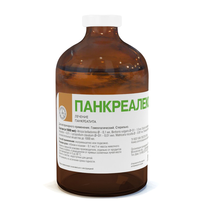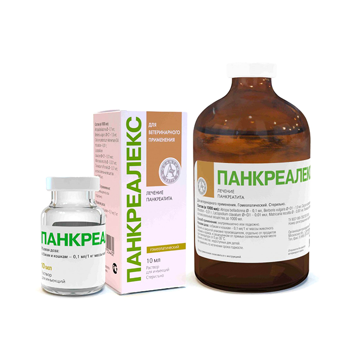 Панкреалекс - первый панкреопротектор, созданный специально для профилактики и лечения панкреатита у собак и кошек. Раствор для инъекций. АКТИВНЫЕ КОМПОНЕНТЫ: Atropa belladonna, Berberis vulgaris, Calcium carbonicum Hahnemanni, Lycopodium clavatum, Matricaria recutita, Taraxacum officinalis. ПОКАЗАНИЯ К ПРИМЕНЕНИЮ: Острый панкреатит у собак и кошек; Экзокринная панкреатическая недостаточность; Хронический панкреатит в составе триадита у кошек; Хронический панкреатит у собак в стадии обострения; Гипергликемия на фоне панкреатита; Заболевания желудочно-кишечного тракта с симптомокомплексом рвота-диарея, сопровождающиеся нарушением функции поджелудочной железы. ФАРМАКОЛОГИЧЕСКИЕ СВОЙСТВА: Оказывает противовоспалительное и протекторное действие на ткань поджелудочной железы, способствует сохранению ацинарных клеток, регулирует экзокринную функцию поджелудочной железы, при панкреатите препятствует развитию гипергликемии, обладает противорвотным действием. Быстрое восстановление функции поджелудочной железы при панкреатите. СПОСОБ ПРИМЕНЕНИЯ, РАЗОВЫЕ ДОЗЫ: Раствор для инъекций: подкожно или внутримышечно. Разовая доза на одно животное составляет: собакам, кошкам – 0,1 мл/1 кг массы животного. ФОРМА ВЫПУСКА: Раствор для инъекций в стеклянных флаконах по 10 и 100 мл. УСЛОВИЯ ХРАНЕНИЯ: Хранить в закрытой упаковке производителя, отдельно от продуктов питания и кормов, в защищенном от прямых солнечных лучей месте при температуре 0 до 30 °С. Срок годности: в закрытой упаковке производителя 3 года с момента производства, после первого вскрытия флакона – 21 день.