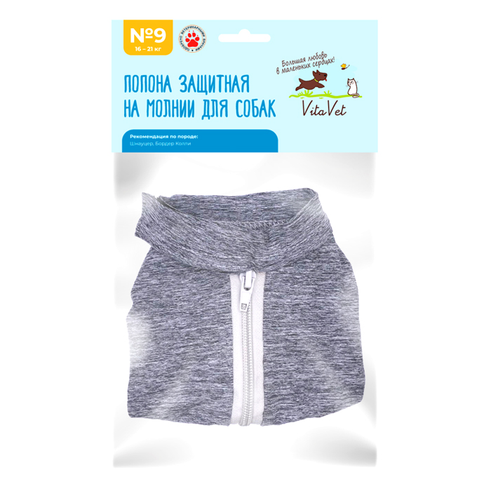 Защитная попона на молнии VitaVet разработана специально для собак с учетом их анатомических особенностей. Попона предназначена для комфортной реабилитации вашего питомца в период после полостной хирургической стерилизации самок, после мастэктомии, при проблемах с кожей и как защита во избежание разлизывания и расчесывания деликатных участков. Попона на молнии VitaVet станет для вас незаменимым помощником по уходу за вашим любимцем и обеспечит вашей собаке комфортное выздоровление. Инструкция по применению: аккуратно наденьте на собаку попону так, чтобы все лапы находились в соответствующих отверстиях, застегните молнию на спине, от хвоста до шеи, и отрегулируйте липучку таким образом, чтобы она не сдавливала шею. Обязательно обратите внимание на размерную таблицу, чтобы точно подобрать попону, которая подходит именно вашей собаке. Размер: № 9. Примерный вес собаки: 16-21кг.