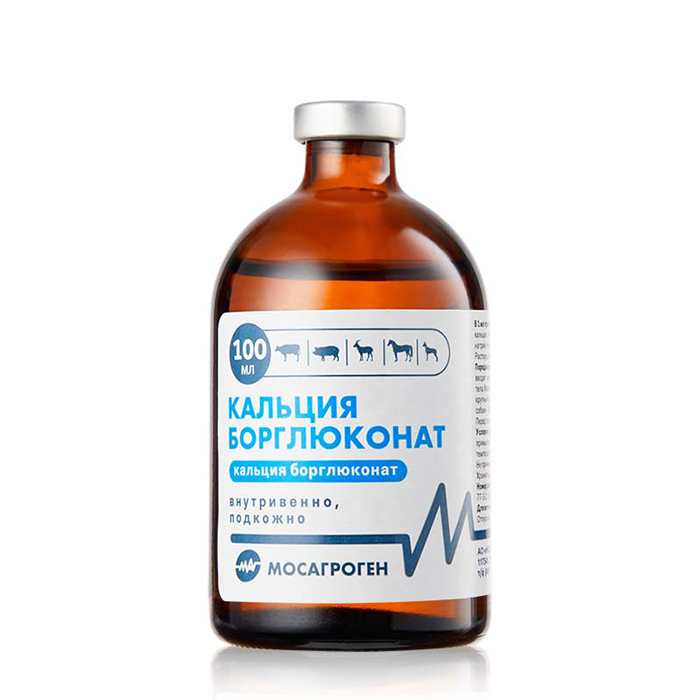 Кальция борглюконат, раствор для инъекций, 100мл. Кальция борглюконат применяют с целью профилактики и лечения животных при следующих заболеваниях: • послеродовой парез, спазмофилия, эклампсия, шоковое состояние, транспортная болезнь, рахит, тетания, остеомаляция; • задержка последа, предродовое и послеродовое залеживание; • аллергические заболевания (крапивница, сывороточная болезнь); • отравление солями магния, токсические поражения печени. Кальция борглюконат оказывает десенсибилизирующее, антитоксическое и противовоспалительное действие; повышает в крови уровень ионизированного кальция, стимулирует обмен веществ, усиливает сокращение сердечной мышцы. Запрещается применение лекарственного препарата при индивидуальной повышенной чувствительности животного к кальцию борглюконату. Противопоказаний и особенностей применения препарата беременным животным, животным в период лактации, потомству животных не установлено. Кальция борглюконат, подогретый до температуры 35 °С – 37 °С, применяют животным внутривенно или подкожно.