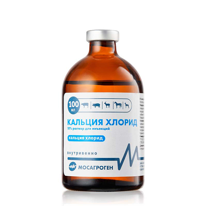 Кальция хлорид 10 %, раствор для инъекций, 100мл. Кальция хлорид 10% раствор для инъекций назначают животным в целях повышения содержания кальция в крови, в качестве противовоспалительного, кровоостанавливающего и десенсибилизирующего средства, для нормализации деятельности симпатической нервной системы при следующих патологических состояниях: