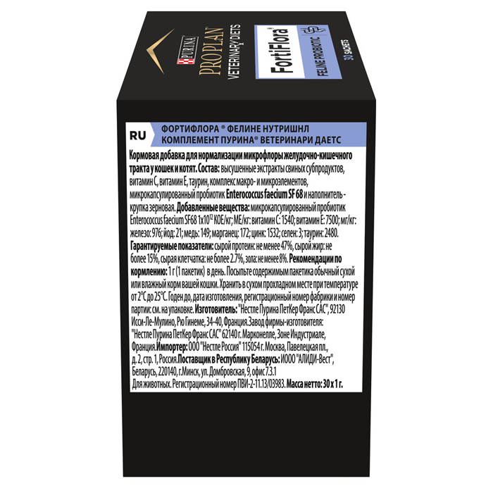 PRO PLAN® FortiFlora кормовая добавка для поддержания баланса микрофлоры желудочно-кишечного тракта у кошек и котят, 30 саше по 1г. Кишечник вашего питомца населяют миллиарды бактерий. Для оптимального здоровья важно сохранять баланс полезных и вредных бактерий. От того, насколько правильно работает пищеварительная система кошки, во многом зависит и ее общее физическое здоровье. Нестабильный аппетит, приступы метеоризма, нарушение консистенции и частоты стула, а также другие негативные признаки могут говорить о том, что в кишечнике питомца нарушен бактериальный баланс. Это мешает усваиваться многим питательным веществам, получаемым с пищей, и ведет к развитию других проблем. Восстановить естественный баланс микрофлоры поможет ветеринарная диета и использование особых пищевых добавок. Специально для питомцев с дисбактериозом команда квалифицированных ветеринарных специалистов и диетологов PURINA разработала кормовую добавку для котят и взрослых кошек PRO PLAN® VETERINARY DIETS FortiFlora® / Для поддержания баланса микрофлоры. Она эффективно справляется с нарушениями работы желудочно-кишечного тракта, вызванными стрессом, перенесенными заболеваниями, лечением антибиотиками, ослаблением иммунной системы и другими факторами. FortiFlora® стала результатом 9 лет передовых научных исследований в области пробиотиков, эта уникальная пробиотическая кормовая добавка помогает восстанавливать здоровье кошек любого возраста в самых разных ситуациях: ✔Нормализует деятельность кишечника и баланс микрофлоры ✔ Способствует нормализации жидкого стула ✔ Способствует росту полезных бактерий ✔Гарантированное содержание жизнеспособных бактерий уникального штамма SF68 — минимум 1 x 10^12 КОЕ/г ✔ Укрепляет иммунную систему. ПРИМЕНЕНИЕ: 1. Используйте 1 пакетик FortiFlora® в сутки, можно на протяжении длительного периода. Посыпьайте содержимым пакетика обычный корм вашей кошки. Рекомендованная длительность применения – не менее одного месяца. Как только у вашего питомца нормализовался стул, продолжайте добавлять 1 пакетик FortiFlora® к его рациону на протяжении не менее еще одной недели. 2. Для восстановления микрофлоры кишечника при лечении антибиотиками ежедневно добавляйте в корм 1 пакетик в течение одной недели после приема его последней дозы. Рекомендованная длительность применения – не менее одного месяца. 4. Для улучшения работы иммунной системы добавляйте к рациону питомца 1 пакетик FortiFlora® в день. Рекомендованная длительность применения – не менее одного месяца. УСЛОВИЯ ХРАНЕНИЯ: Хранить в сухом прохладном месте.
