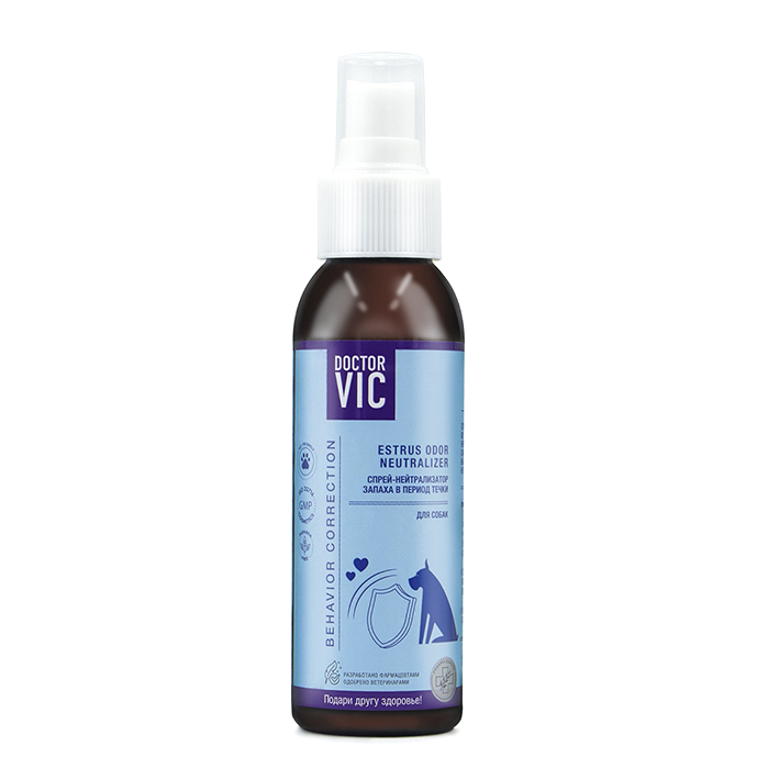 Спрей DOCTOR VIC для нейтрализации запаха в период течки для собак, 100мл. Спрей предназначен для защиты во время течки сук от кобелей. Нейтрализует специфический запах, обеспечивая спокойный выгул вашего питомца. Не является контрацептивом.