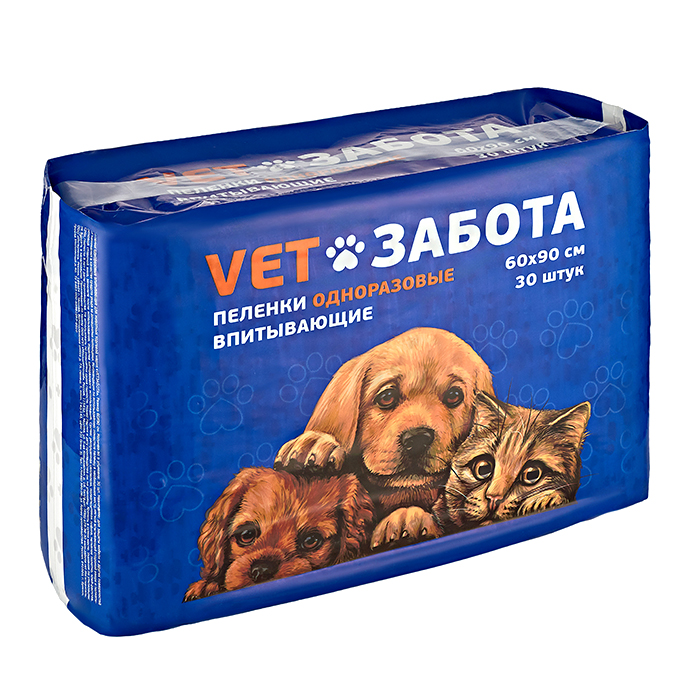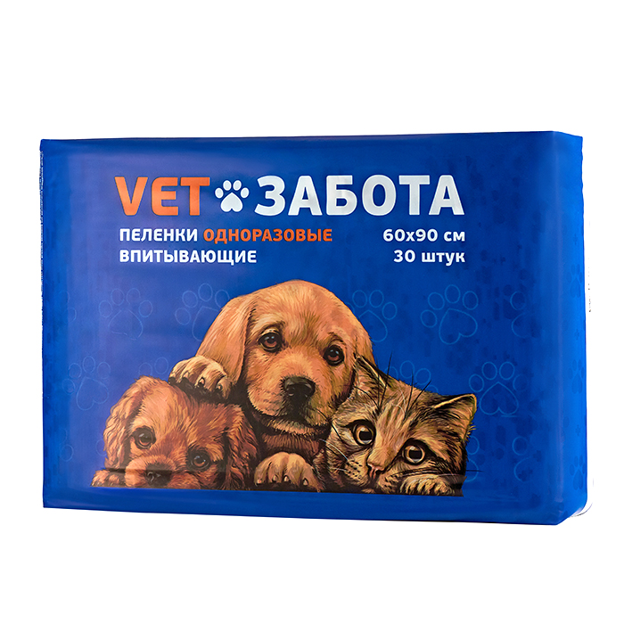 Пеленки VETЗАБОТА впитывающие, одноразовые, размер 60*90см, 30шт в упаковке. Пеленки предназначены для защиты мебели и других поверхностей от намокания