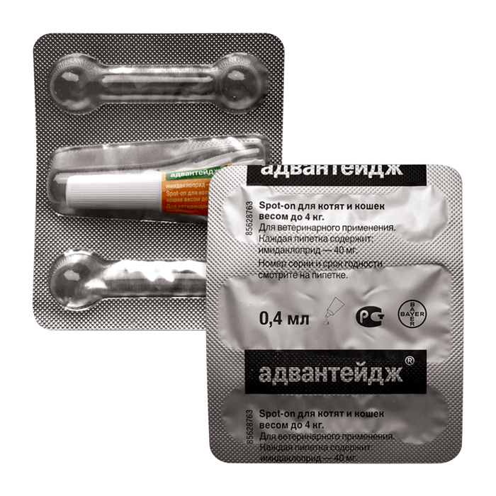 Адвантейдж® капли на холку от блох для котят и кошек до 4кг – 1 пипетка. Адвантейдж® помогает защитить кошек от блох, их укусов, снижая риск передачи переносимых ими заболеваний. Капли от блох Адвантейдж® содержат действующее вещество имидаклоприд, которое начинает действовать на блох уже в течение 3-5 минут после контакта. В отличие от других доступных средств (например, выпускаемых в форме таблеток), Адвантейдж® применяется в виде капель на холку. Активное вещество распространяется по коже и шерсти животного, действуя на большинство блох до укуса. При первом применении гибель паразитирующих на животном насекомых происходит в течение 12 часов, далее до четырех недель Адвантейдж® помогает защитить от повторного заражения блохами. Адвантейдж® – препарат компании Elanco. Характеристики: ✅ Действует от блох, личинок блох, вшей, власоедов ✅ Работает на коже и шерсти животного, а не внутри ✅ Гибель паразитирующих на животном насекомых наступает уже через 12 часов ✅ Разрешен котятам и декоративным кроликам с 10-недельного возраста ✅ Форма: капли на холку ✅ Частота применения: для профилактики – раз в месяц; для лечения БАД – по назначению врача; по наличии блох – однократно ✅ Срок годности – 5 лет ✅ Произведено в Германии. Показания: Адвантейдж® применяют с целью уничтожения насекомых (блох, вшей, власоедов), паразитирующих на собаках и кошках. Препарат Адвантейдж® также разрешен к применению декоративным кроликам, для профилактики и лечения заражения блохами. Действующее вещество: Имидаклоприд начинает действовать на блох, вшей, всласоедов вскоре после их попадания на шерсть обработанного животного. Активное вещество практически не всасывается в кровь, а остается на поверхности кожи и шерсти вашей кошки. Рекомендации по применению: Адвантейдж® подбирается по весу животного. Препарат применяют наружно, путем нанесения на кожу в области холки. Введение препарата Адвантейдж®: 1. Возьмите пипетку из упаковки. 2. Удерживая пипетку вертикально, открутите и снимите защитный колпачок. 3. Поверните колпачок обратной стороной и проколите защитную мембрану носика пипетки, затем снова снимите колпачок. 4. Раздвиньте шерсть на холке питомца у основания шеи так, чтобы кожа стала видимой. Поместите кончик пипетки на кожу и крепко сожмите несколько раз, чтобы нанести её содержимое прямо на кожу. Противопоказания: Противопоказанием к применению является индивидуальная повышенная чувствительность животного к компонентам препарата. Адвантейдж® не разрешается применять котятам и декоративным кроликам моложе 10-недельного возраста. ИМЕЮТСЯ ПРОТИВОПОКАЗАНИЯ. ОЗНАКОМЬТЕСЬ С ИНСТРУКЦИЕЙ.