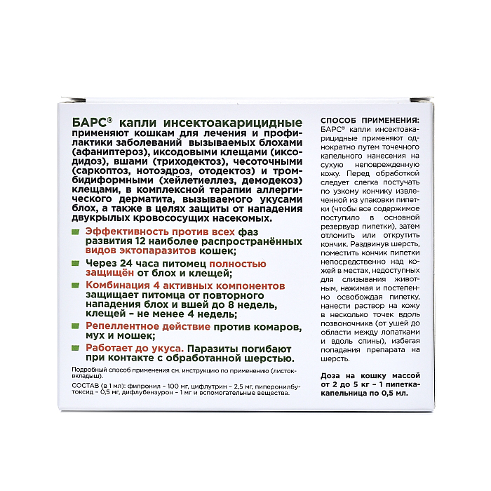 БАРС® капли инсектоакарицидные для кошек в качестве действующих веществ в 1 мл содержит фипронил – 100 мг, цифлутрин – 2,5 мг, пиперонилбутоксид – 0,5 мг, дифлубензурон – 1 мг.