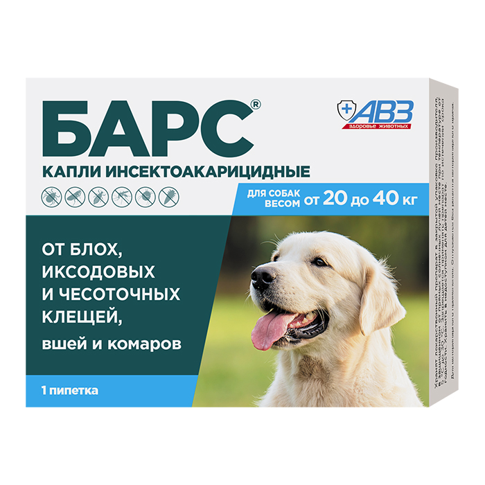 Барс капли от блох, клещей и комаров для собак 20-40кг, 1 пипетка 2,68мл, АВЗ