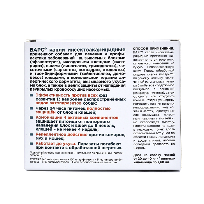 БАРС капли инсектоакарицидные для собак весом 20-40кг, 1 пипетка. ПОКАЗАНИЯ К ПРИМЕНЕНИЮ: БАРС® капли инсектоакарицидные применяют собакам и кошкам для лечения и профилактики заболеваний вызываемых блохами (афаниптероз), иксодовыми клещами (иксодидоз), вшами (линогнатоз, триходектоз), чесоточными (саркоптоз, нотоэдроз, отодектоз) и тромбидиформными (демодекоз, хейлетиеллез) клещами, в комплексной терапии аллергического дерматита, вызываемого укусами блох, а также в целях защиты от нападения двукрылых кровососущих насекомых. ПРЕИМУЩЕСТВА: ✔ Эффективность против всех фаз развития 13 наиболее распространённых видов эктопаразитов собак ✔ Через 24 часа питомец полностью защищён от блох и клещей ✔ Комбинация 4 активных компонентов защищает питомца от повторного нападения блох и вшей до 8 недель, клещей – не менее 4 недель ✔ Репеллентное действие против комаров, мух и мошек ✔ Работает до укуса. Паразиты погибают при контакте с обработанной шерстью. СОСТАВ И ФАРМАКОЛОГИЧЕСКИЕ СВОЙСТВА: Лекарственный препарат обладает выраженным контактным инсектоакарицидным и репеллентным действием, активен в отношении личиночных и половозрелых фаз развития блох, вшей, иксодовых, саркоптоидных и тромбидиформных клещей, паразитирующих на собаках и кошках, предотвращает нападение на животных двукрылых кровососущих насекомых (мух, комаров, мошек, москитов). Фипронил, входящий в состав препарата, приводит к неконтролируемой активности центральной нервной системы и гибели эктопаразитов. Цифлутрин – синтетический пиретроид обладает контактным инсектицидным и репеллентным действием, механизм которого заключается в блокировании передачи нервных импульсов, что вызывает нарушение координации движений, паралич и гибель насекомых при первом контакте с шерстью обработанного животного (до укуса). Пиперонилбутоксид является синергистом пиретроидов, улучшает проникновение пиретроида через кутикулу, усиливает его влияние на нервную систему, ускоряет наступление паралича и гибель эктопаразита. Дифлубензурон – нарушает гормональные процессы, обеспечивающие синтез хитина в организме личинок членистоногих, что нарушает процесс линьки, вызывая образование нежизнеспособных форм, прекращение яйцекладки, выводимости личинок из яиц и пополнение популяции. После накожного нанесения лекарственного препарата входящие в его состав активные вещества, равномерно распределяются по поверхности тела, не всасываясь в системный кровоток, накапливаются в эпидермисе, волосяных луковицах и сальных железах тела животного, оказывают длительное контактное инсектоакарицидное и репеллентное действие. Однократная обработка животного обеспечивает гибель блох в течение 24 часов, иксодовых клещей, вшей – в течение 48 часов. Защитное действия препарата продолжается против иксодовых клещей до 4 недель, против блох, вшей и хейлетиелл – до 8 недель; репеллентного действия против двукрылых кровососущих насекомых – до 7 дней. ПРОТИВОПОКАЗАНИЯ: Противопоказанием к применению является повышенная индивидуальная чувствительность животного к компонентам лекарственного препарата. Не подлежат обработке больные инфекционными болезнями и ослабленные собаки и кошки, а также животные других видов. Не допускается аурикулярное применение препарата при прободении барабанно