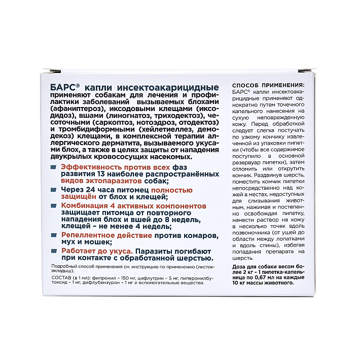 Фипронил, входящий в состав препарата, приводит к неконтролируемой активности центральной нервной системы и гибели эктопаразитов. Цифлутрин – синтетический пиретроид обладает контактным инсектицидным и репеллентным действием, механизм которого заключается в блокировании передачи нервных импульсов, что вызывает нарушение координации движений, паралич и гибель насекомых при первом контакте с шерстью обработанного животного (до укуса). Пиперонилбутоксид является синергистом пиретроидов, улучшает проникновение пиретроида через кутикулу, усиливает его влияние на нервную систему, ускоряет наступление паралича и гибель эктопаразита. Дифлубензурон – нарушает гормональные процессы, обеспечивающие синтез хитина в организме личинок членистоногих, что нарушает процесс линьки, вызывая образование нежизнеспособных форм, прекращение яйцекладки, выводимости личинок из яиц и пополнение популяции. После накожного нанесения лекарственного препарата входящие в его состав активные вещества, равномерно распределяются по поверхности тела, не всасываясь в системный кровоток, накапливаются в эпидермисе, волосяных луковицах и сальных железах тела животного, оказывают длительное контактное инсектоакарицидное и репеллентное действие. Однократная обработка животного обеспечивает гибель блох в течение 24 часов, иксодовых клещей, вшей – в течение 48 часов. Защитное действия препарата продолжается против иксодовых клещей до 4 недель, против блох, вшей и хейлетиелл – до 8 недель; репеллентного действия против двукрылых кровососущих насекомых – до 7 дней. ПРОТИВОПОКАЗАНИЯ: Противопоказанием к применению является повышенная индивидуальная чувствительность животного к компонентам лекарственного препарата. Не подлежат обработке больные инфекционными болезнями и ослабленные собаки и кошки, а также животные других видов. Не допускается аурикулярное применение препарата при прободении барабанной перепонки. Обработку собак и кошек массой менее 2 кг следует проводить с осторожностью под наблюдением ветеринарного врача. Запрещается применение препарата БАРС® капли инсектоакарицидные щенкам и котятам моложе 8-недельного возраста. Обработку собак и кошек в период беременности и вскармливания потомства при необходимости проводят с осторожностью под наблюдением ветеринарного врача. ПОРЯДОК ПРИМЕНЕНИЯ: Применяют однократно путем точечного капельного нанесения на сухую неповрежденную кожу. Щенкам и собакам массой до 20 кг препарат наносят на кожу в 2-4 точки, собакам массой более 20 кг – в 4-6 и более точек. С учетом массы обрабатываемого животного выбирают пипетку необходимой модификации и объема. Для обработки собак массой свыше 60 кг используют комбинацию пипеток из расчета 0,67 мл препарата на каждые дополнительные 10 кг массы; при обработке собак массой менее 2 кг – из расчета три капли препарата (0,07 мл) на 1 кг массы животного. Не следует мыть и купать животных с шампунем за 48 ч перед и 24 ч после обработки. Последующее купание животного без моющего средства не влияет на продолжительность действия препарата.
