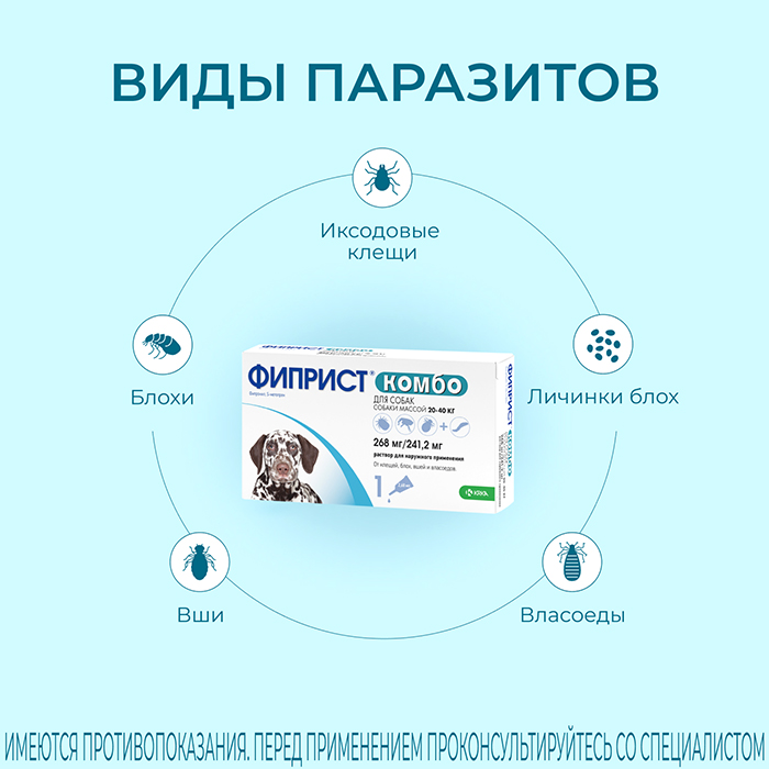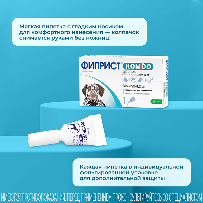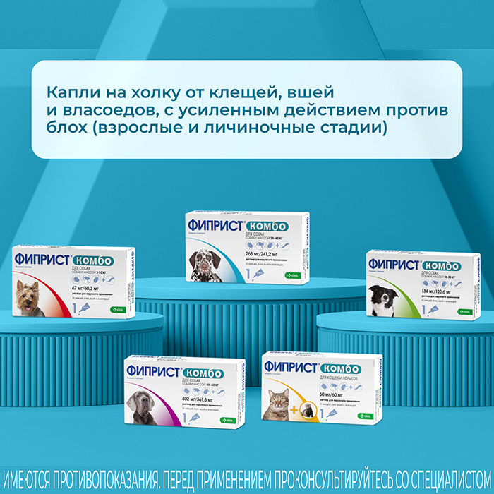 Фиприст® Комбо— капли на холку для защиты собак от иксодовых клещей, блох и власоедов с усиленным действием против блох. Содержит (S)-метопрен – регулятор роста насекомых, действующий на личиночные стадии блох и предотвращающий их развитие во взрослых особей в окружающей среде, для профилактики повторного заражения животного. Достоинства препарата: