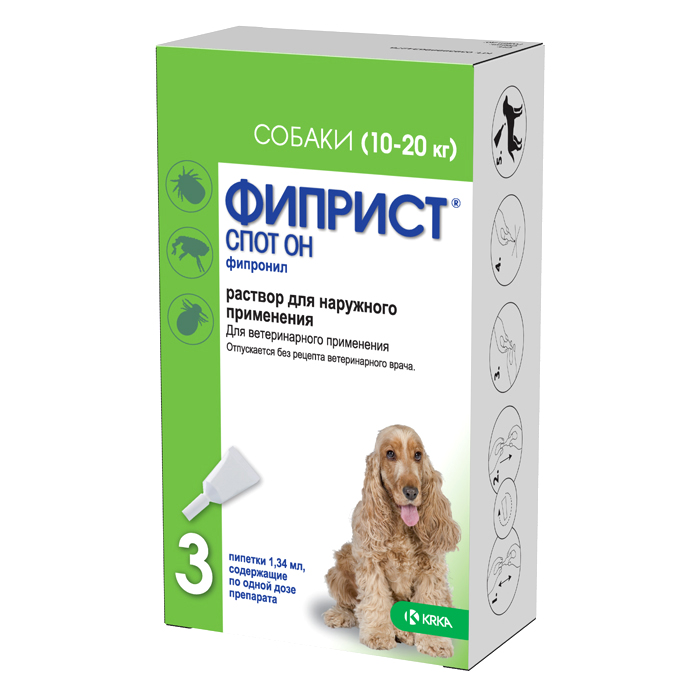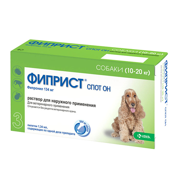 ФИПРИСТ СПОТ ОН 134мг препарат от клещей, блох, вшей, власоедов для собак весом 10-20кг, 3 пипетки, KRKA Fiprist