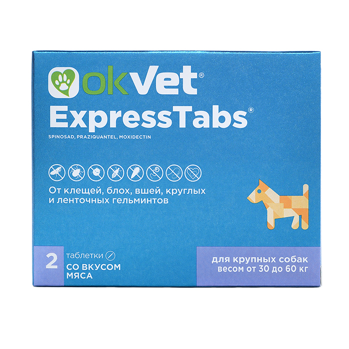 Оквет ЭКСПРЕССТАБС препарат от блох, клещей, вшей и гельминтов для собак весом 30 - 60кг, 2 таблетки, АВЗ OkVet ExpressTabs