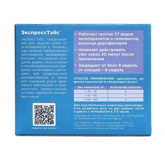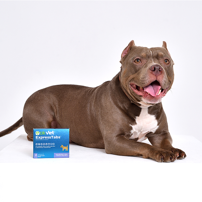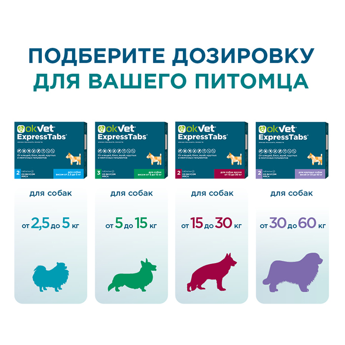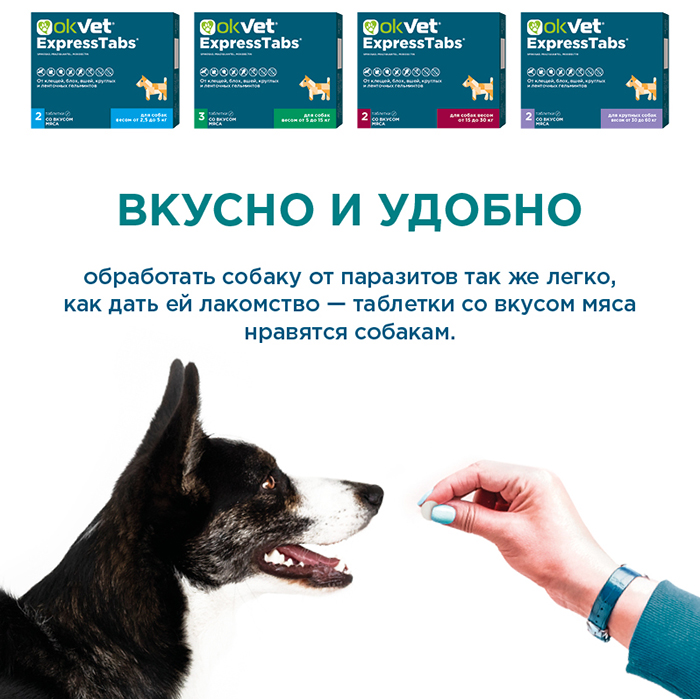 OKVET® EXPRESSTABS таблетки от клещей, блох, вшей и гельминтов для собак от 30 до 60кг, 2 таблетки. Противопаразитарный препарат для собак комбинированного действия для лечения и профилактики паразитарных заболеваний, вызываемых блохами, клещами, вшами и гельминтами. ПРЕИМУЩЕСТВА: ✔ защищает уже через 30 минут после применения ✔ от 37 видов внешних и внутренних паразитов ✔ защита от блох до 56 дней, от клещей до 42 дней ✔ защита не смывается при купании, мытье шампунем и под дождем ✔ можно гладить и обнимать любимца ✔ таблетки со вкусом мяса нравятся собакам ✔ обработать собаку от паразитов так же легко, как дать ей лакомство. ФАРМАКОЛОГИЧЕСКИЕ СВОЙСТВА: Входящие в состав препарата активные вещества обеспечивают широкий спектр его противопаразитарного действия в отношении: блох, иксодовых клещей, вшей, чесоточных клещей, тромбидиформных клещей, круглых гельминтов – нематод и ленточных гельминтов – цестод, паразитирующих у собак. Противопаразитарное действие препарата начинается через 30 минут после применения и обеспечивает гибель паразитов в течение 24-48 часов. Гибель блох, появившихся на животном, происходит до откладки яиц, что предотвращает контаминацию помещений яйцами и личинками и прерывает цикл развития популяции насекомых. Защитное действия препарата против повторного нападения иксодовых клещей продолжается до 42 дней, против блох и вшей – до 56 дней. ПОКАЗАНИЯ: ЭкспрессТабс® назначают взрослым собакам и щенкам для лечения и профилактики ассоциативных паразитарных заболеваний, вызываемых блохами, иксодовыми клещами, вшами, чесоточными и тромбидиформными клещами, нематодами и цестодами, для профилактики дирофиляриоза, вызываемого личинками Dirofilaria immitis и Dirofilaria repens, а также снижения риска заражения бабезиозом и боррелиозом, переносчиками которых являются иксодовые клещи. ПРОТИВОПОКАЗАНИЯ: Противопоказанием к применению ЭкспрессТабс® является повышенная индивидуальная чувствительность животного к компонентам препарата (в том числе в анамнезе), истощение, инфекционные заболевания, гипертермия, выраженные нарушения функции печени и почек. Запрещается применение лекарственного препарата сукам в период беременности и вскармливания приплода, щенкам моложе 6-недельного возраста и/или массой менее 0,6 кг. Не следует применять препарат собакам пород, чувствительных к макроциклическим лактонам, в том числе австралийская овчарка (аусси), белая овчарка, бобтейл (староанглийская овчарка), бордер-колли, колли короткошерстный, колли длинношерстный, макнаб, уиппет длинношерстный, шелковистый виндхаунд, шелти и их метисам. ДОЗЫ И ПОРЯДОК ПРИМЕНЕНИЯ: ЭкспрессТабс® применяют животным однократно, перорально (внутрь) с небольшим количеством корма (лакомства) во время кормления или вводят на корень языка сразу после кормления. Минимальная терапевтическая доза препарата на 1 кг массы животного составляет: 30 мг спиносада + 5 мг празиквантела + 0,2 мг моксидектина. Дозы ЭкспрессТабс® в зависимости от массы животного и модификации используемой таблетки представлены в инструкции. ПОБОЧНЫЕ ЯВЛЕНИЯ: При признаках повышенной чувствительности животного или индивидуальной непереносимости к веществам, входящим в состав ЭкспрессТабс®, а также при появлении аллергических реакций, применение препарата следует прекратить, провести симптомат