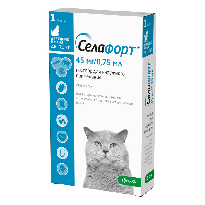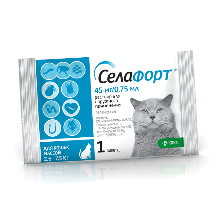 СЕЛАФОРТ 45мг препарат от внешних и внутренних паразитов для кошек весом 2,6-7,5кг, 1 пипетка, KRKA Selafort