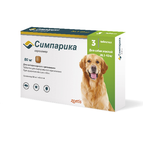 Симпарика - таблетка 80 мг применяется для собак весом от 20 до 40 кг и возрастом от 8 недель, 3 шт. в упаковке.