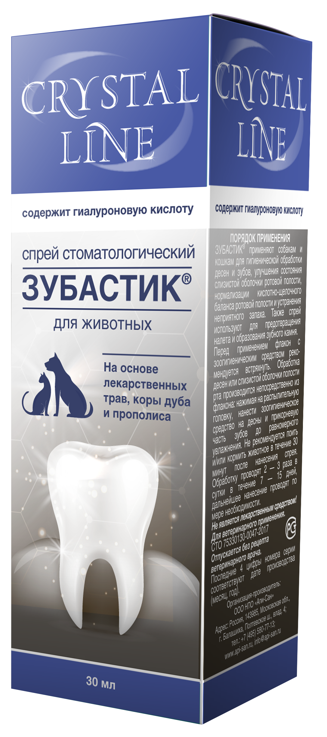 ЗУБАСТИК КРИСТАЛ ЛАЙН спрей для гигиенической обработки ротовой полости Собак и Кошек, флакон 30 мл. APICENNA