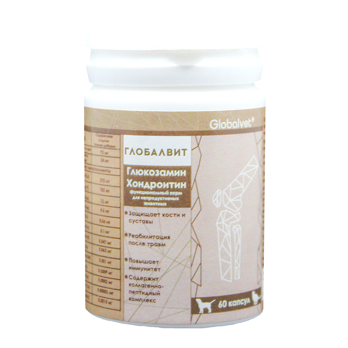 Глобалвит ГЛЮКОЗАМИН ХОНДРОИТИН хондропротектор для собак и кошек, 60 капсул, GLOBALVET