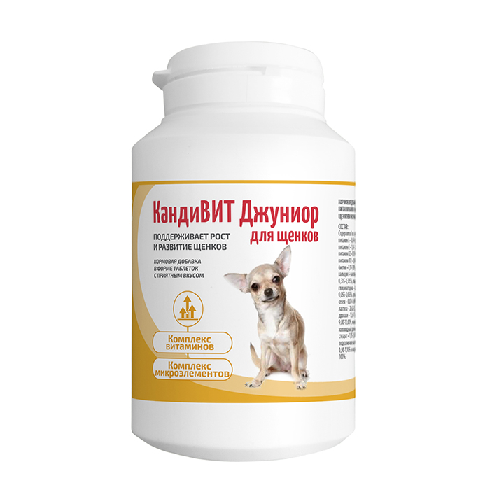 КандиВИТ Джуниор – кормовая добавка для обогащения рациона щенков витаминами и микроэлементами и нормализации обмена веществ. Показания к применению: Для нормализации обмена веществ и улучшения роста и развития щенков и молодых собак. Способ применения и дозировка: Кормовую добавку применяют ежедневно перорально или с кормом. Щенкам с 3-х месячного возраста: - при массе тела от 3 кг до 5 кг - ½ таблетки; - при массе тела от 6 кг до 10 кг - 1 таблетка; - при массе тела свыше 10 кг - из расчёта 1 таблетка на каждые 10 кг массы животного, но не более 5 таблеток в день. Щенкам старше 3-х месячного возраста, чья масса не достигла 3 кг, применение кормовой добавки возможно при рекомендации ветеринарного врача в дозе ½ таблетки. Курс применения составляет 30 дней. Возможно повторное применение при необходимости.